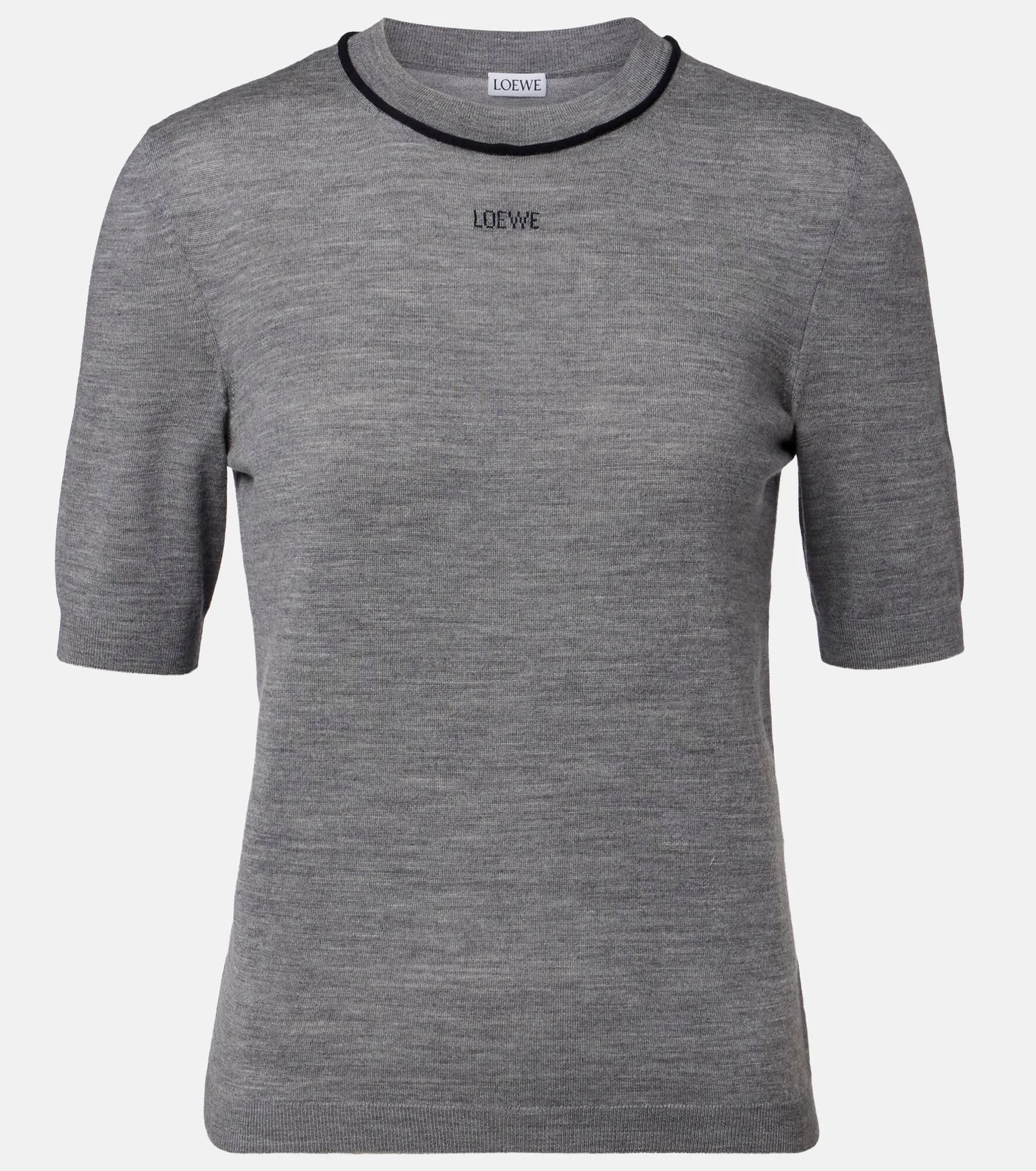 Finely knitted from pure wool, this sweater from Loewe makes for a polished layering piece. The style is finished with a contrasting trim at the neckline and subtle logo lettering on the front. Product Details - Material: 100% wool - Care instructions: dry clean - Made in Italy - Color: grey - Designer color name: Grey/Navy Blue - Cuff: ribbed - Hem: ribbed - Item number: P01141983 Size & Fit - True to size - Fitted - Stretchy fabric - Falls to the hip - The model seen in the picture is 178cm-5'10" and wearing a size XS