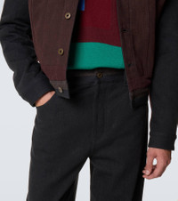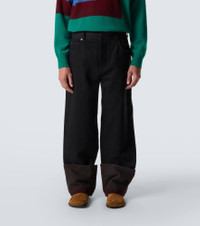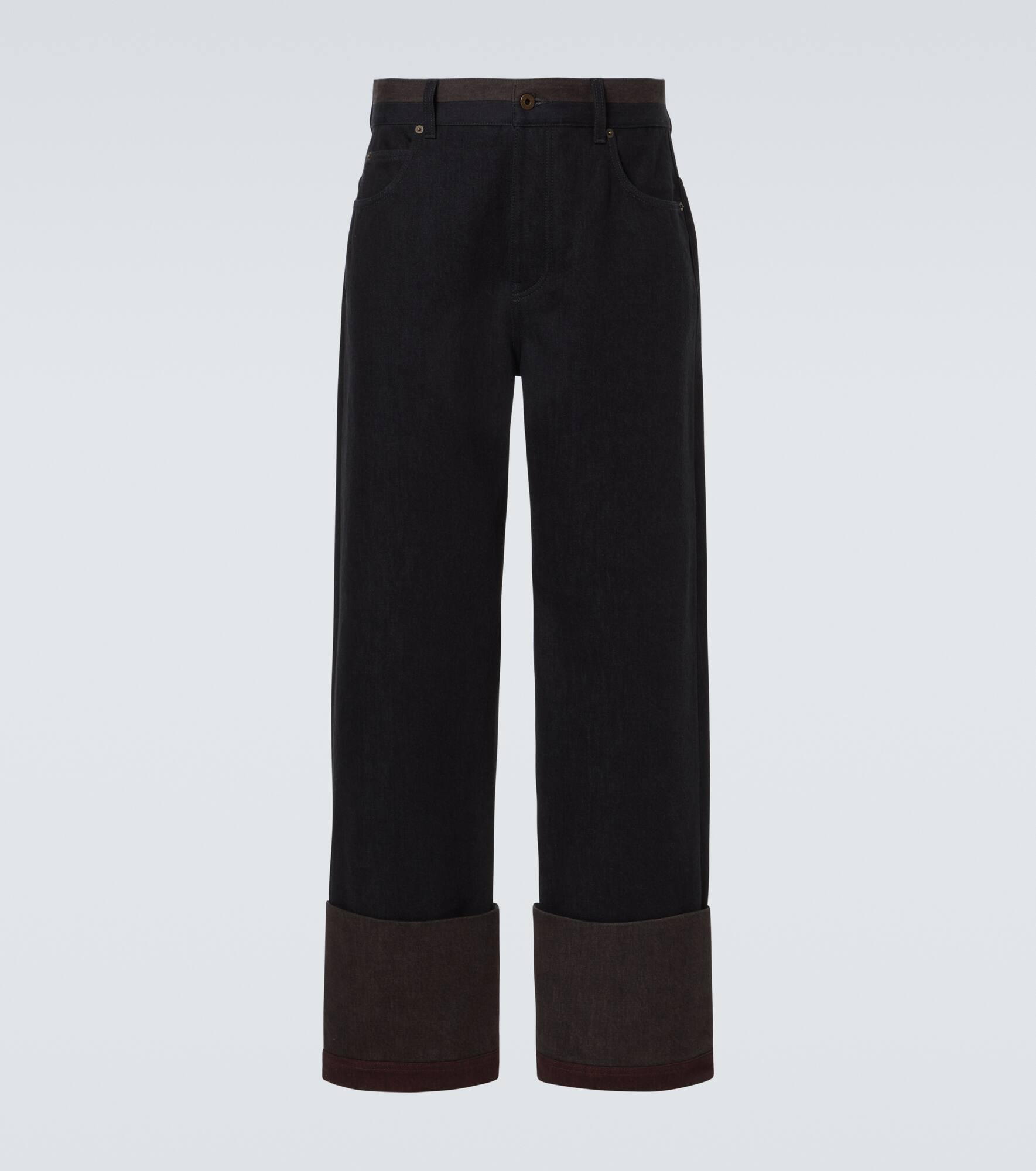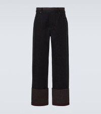 These Loewe jeans are tailored to a straight silhouette, detailed with folded hems in contrasting hues. The mid-rise waistline features a colorblocked trim and an adjustable tab, while the back is adorned with a leather logo patch. Product Details - Material: 100% cotton - Care instructions: dry clean - Made in Italy - Designer color name: Black/Burgundy - Item color: black, burgundy - Pocket lining: 65% polyester, 35% cotton - Details: 100% calf leather - Details II: 100% cotton - Contains non-textile parts of animal origin - Belt loops - Pockets: five pockets - Closure: button fastening - Item number: P01098412 Size & Fit - True to size - Non-stretchy fabric - Straight leg - Mid-rise - The model in the picture is 185cm-6'1" and wearing a size 50