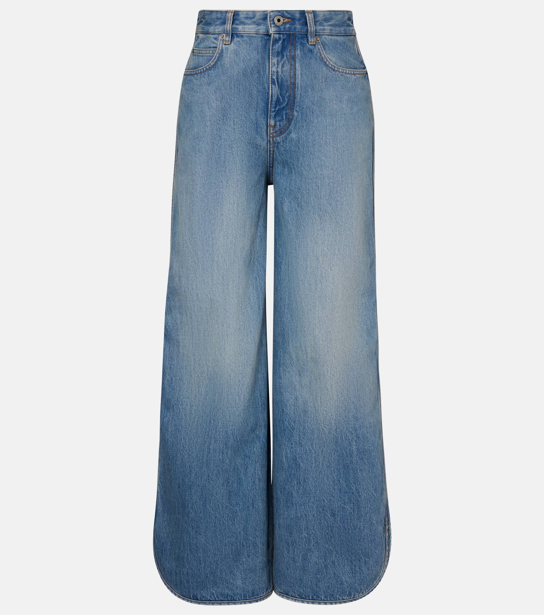 Founded in 1846 as a leathermaking company, Loewe maintains a commitment to art and craft of the utmost quality. Made from cotton denim, these mid-rise jeans come in a wide-leg silhouette and feature piping detailing down the sides. Product Details - Material: 100% cotton - Care instructions: machine wash at 30 degrees - Made in Italy - Designer color name: Denim Blue - Item color: blue - Details: 100% calf leather - Pocket lining: 65% polyester, 35% cotton - Contains non-textile parts of animal origin - Closure: zip and button fastening - Pockets: five pockets - Belt loops - Hem: rounded - Item number: P01066205 Size & Fit - True to size - Non-stretchy fabric - Wide-leg - Mid-rise - The model seen in the picture is 178cm-5'10" and wearing a size FR 34