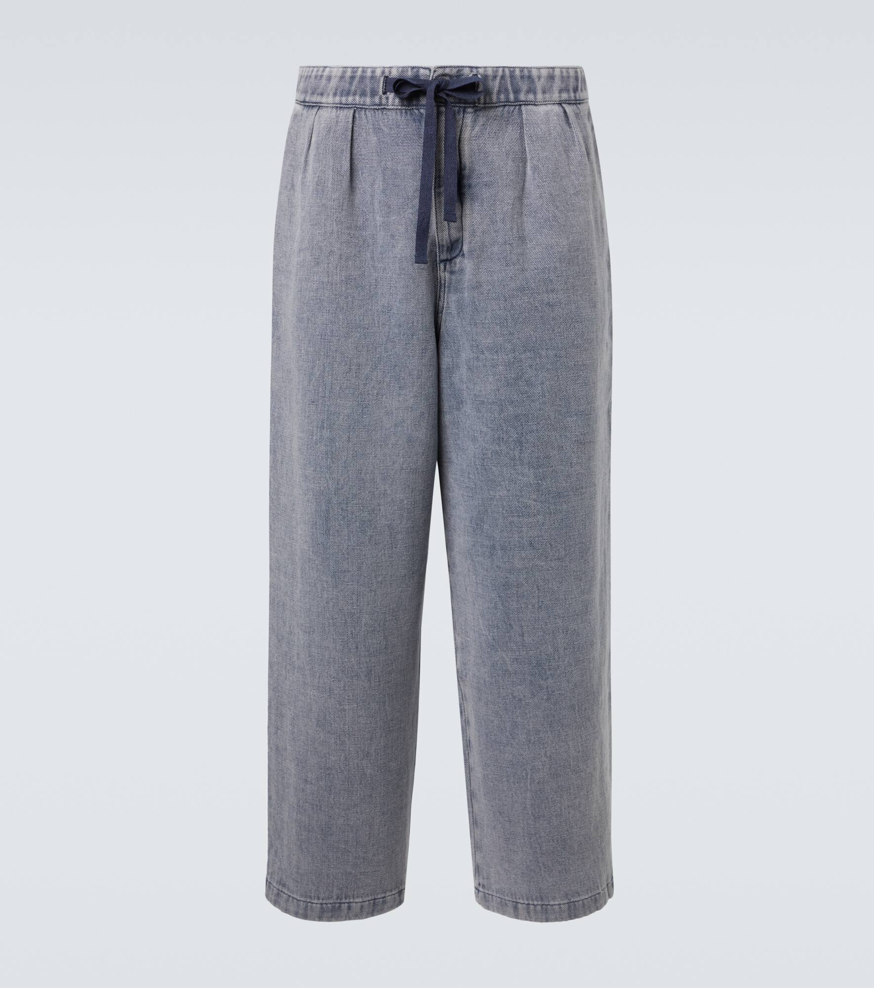 Crafted in Italy from cotton and linen denim, these wide-leg jeans from Loewe feature a drawstring waist. The piece is cut to a relaxed silhouette. Product Details - Material: 79% cotton, 21% linen - Care instructions: machine wash at 30 degrees - Made in Italy - Designer color name: Grey Blue - Item color: blue - Details: 100% calf leather - Drawstring waist - Pockets: side slit pockets, back pocket - Closure: button fastening - Contains non-textile parts of animal origin - Item number: P01063193 Size & Fit - True to size - Elasticated waist - Adjustable at the waist - Non-stretchy fabric - Wide-leg - Mid-rise - Height of model is 189cm-74.5" and wears a size 50