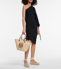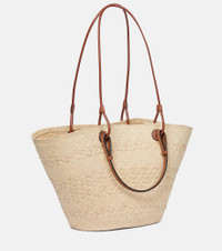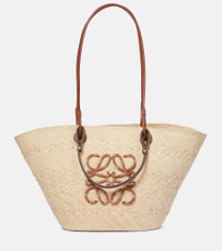 This beige basket bag from Loewe's Paula's Ibiza collection is woven in Colombia from iraca palm by female artisans from the Corporación Oficio y Arte NGO; a collective that provides opportunities for financial independence. The capacious design is embroidered with the label's iconic Anagram logo on its front face and features two sets of practical straps. Product Details - Made in Spain - Designer color name: Natural/Tan - Trim: calf leather - Comes with dust bag - Top handles - Closure: open top - Item number: P00564805 Size & Fit - Height 24cm-9.5" - Min. width 22cm-8.5" - Max. width 44cm-17.5" - Depth 13cm-5" - Length of handles 40cm-15.5" - Length shoulder strap 67cm-26.5"
