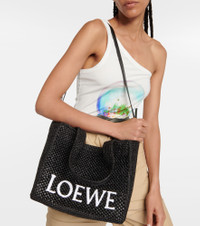 Woven from raffia, this Medium tote bag has logo detailing on the front, twin top handles, a removable leather shoulder strap, and an internal slot pocket. This piece is part of a continuing collaboration that combines Loewe's artisan legacy with the carefree spirit of Paula's Ibiza. Product Details - Made in Spain - Material: raffia - Designer color name: Black - Detachable, adjustable shoulder strap, Top handles - Comes with dust bag - Closure: open top - Item number: P00812257 Size & Fit - Height 25cm-10" - Width 29cm-11.5" - Depth 14cm-5.5" - Length of handles 47cm-18.5" - Min. length shoulder strap 82cm-32.5" - Max. length shoulder strap 102cm-40"