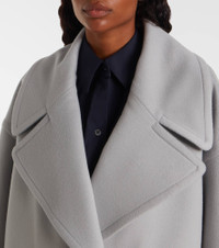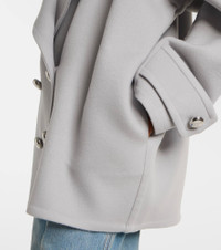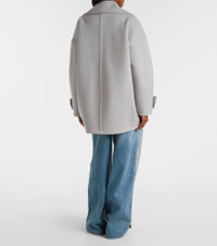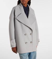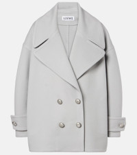 Founded in 1846 as a leathermaking company, Loewe maintains a commitment to art and craft of the utmost quality. This peacoat is Italian-made from medium-weight wool into a cocoon silhouette with signature Anagram Pebble buttons. Product Details - Material: 100% wool - Care instructions: dry clean - Made in Italy - Designer color name: Grey - Item color: gray - Pocket lining: 100% cotton - Hardware color: silver - Notched lapel - Cuff: buttoned - Closure: double-breasted (four buttons) - Pockets: side slit pockets - Unlined - Item number: P01066105 Size & Fit - True to size - For a closer fit, we recommend taking one size down - Dropped shoulders - Oversized - Non-stretchy fabric - Falls below the hip - The model seen in the picture is 178cm-5'10" and wearing a size FR 34