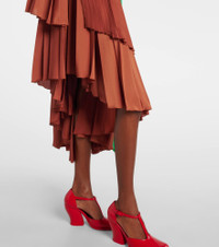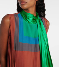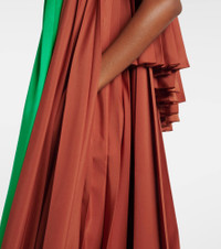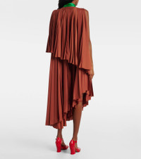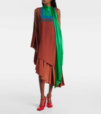 Loewe embraces bold detailing in this midi dress, steering far from minimalism. Cut from fluid jersey, the design showcases an asymmetric, layered silhouette with a pleated overlayer, a geometric neckline motif, and a satin self-tie collar. Product Details - Material: 100% polyester - Care instructions: dry clean - Made in Spain - Designer color name: Caramel/Bright Green - Item color: brown, green - Trim: 100% silk - Self-tie collar - Closure: zipped side - Pockets: side slit pockets - Contains non-textile parts of animal origin - Item number: P01104977
