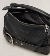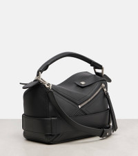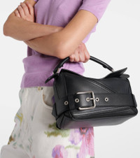 The Puzzle Biker Small tote bag from Loewe showcases the brand's iconic cuboid silhouette with biker-inspired edge. Crafted from supple shiny leather, the design is finished with a wrap-around belt and silver-tone buckle detail. Product Details - Material: leather - Lining: fabric - Made in Spain - Designer color name: Black - Item color: black - Internal details: internal slot pocket - Closure: zipped top - Top handle, Detachable, adjustable shoulder strap - Includes: dust bag - Item number: P01065702 Size & Fit - Height 16cm-6.5" - Width 24cm-9.5" - Depth 10cm-4" - Length of handles 31cm-12" - Adjustable shoulder strap - Length shoulder strap 112cm-44"