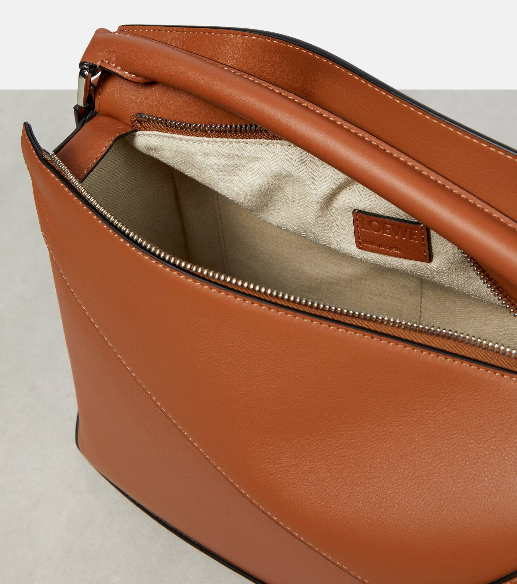 Look no further for a perfect contemporary shoulder bag than the Puzzle Edge from Loewe. The brown leather of this piece features an asymmetrical geometrical pattern, adding a touch of modernity to your wardrobe. Product Details - Top handle, Detachable, adjustable shoulder strap - Made in Spain - Designer color name: Tan - Protective feet - Comes with dust bag - Internal details: fabric lining, internal slot pockets - Closure: zipped top - Material: leather - Item number: P00845591 Size & Fit - Height 19cm-7.5" - Width 28cm-11" - Depth 12cm-4.5" - Length of handle 34cm-13.5" - Min. length shoulder strap 73cm-28.5" - Max. length shoulder strap 115cm-45.5"
