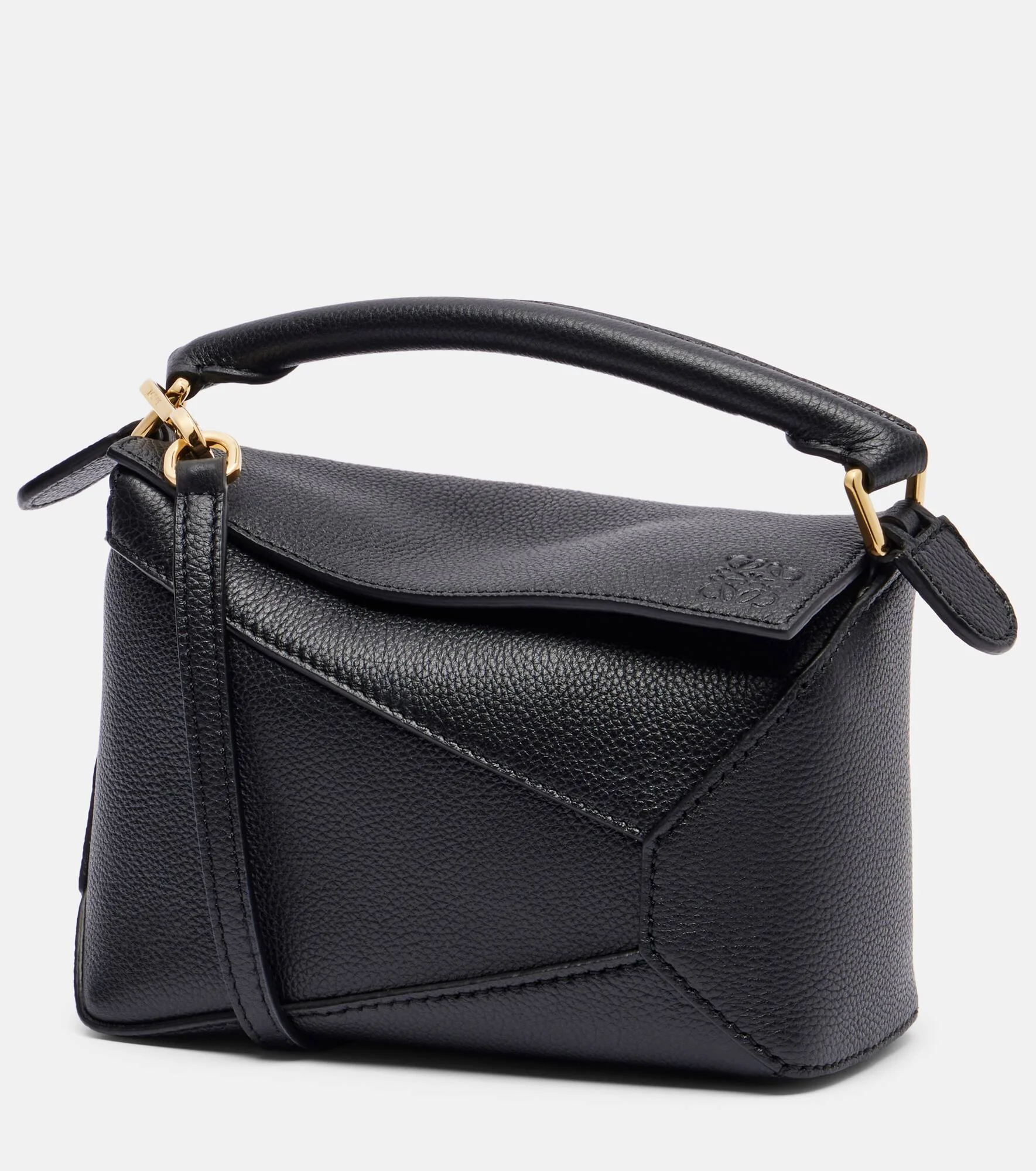 Look no further for a perfect contemporary tote bag than the Puzzle Edge Mini from Loewe. Crafted from leather, this piece boasts an asymmetrical, geometric pattern, adding a touch of modernity to your wardrobe. Product Details - Material: calf leather - Lining: fabric - Made in Spain - Designer color name: Black - Item color: black - Hardware color: gold - Closure: zipped top - Top handle, Detachable, adjustable shoulder strap - Includes: dust bag - Item number: P01106280 Size & Fit - Height 11/13cm-4.5/5" - Width 17cm-6.5" - Depth 7.5cm-3" - Length of handles 22cm-8.5" - Adjustable shoulder strap - Max. length shoulder strap 135cm-53"