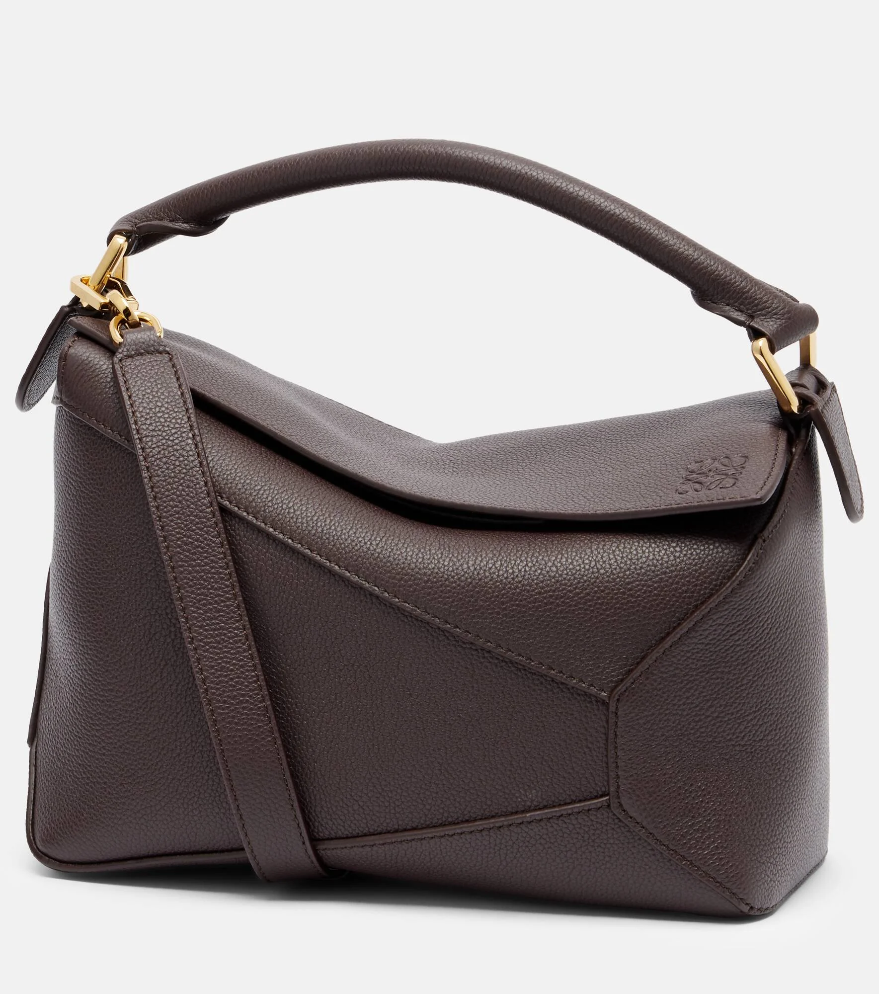 Loewe's Puzzle Edge gives the brand's most iconic bag a modern update with continuous, overlapping panels. Crafted from grained calf leather, the design features a zipped top and a top handle alongside a detachable strap. Product Details - Material: calf leather - Lining: fabric - Made in Spain - Designer color name: Dark Brownie - Item color: brown - Hardware color: gold - Closure: zipped top - Internal details: internal slot pocket - Top handle, Detachable, adjustable shoulder strap - Zipped back pocket - Includes: dust bag - Item number: P01124130 Size & Fit - Height 16cm-6.5" - Width 24cm-9.5" - Depth 10cm-4" - Length of handle 30cm-12" - Min. length shoulder strap 84cm-33" - Max. length shoulder strap 117cm-46"