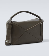 Created to reflect Loewe's multifaceted identity, the Puzzle bag is made by leather artisans who cut unique geometric panels and place them in their now-iconic asymmetric setting. This Large top-handle bag comes with a detachable and adjustable shoulder strap. Product Details - Material: calf leather - Lining: suede - Made in Spain - Color: green - Designer color name: Dark Khaki - Top handle, Detachable, adjustable shoulder strap - Closure: zipped top - Internal details: internal slot pocket - Zipped back pocket - Protective feet - Includes: dust bag - Item number: P01123346 Size & Fit - Height 22cm-8.5" - Width 33,5cm-13" - Depth 13,5cm-5.5" - Length of handle 40cm-15.5" - Adjustable shoulder strap - Min. length shoulder strap 80cm-31.5" - Max. length shoulder strap 120cm-47"