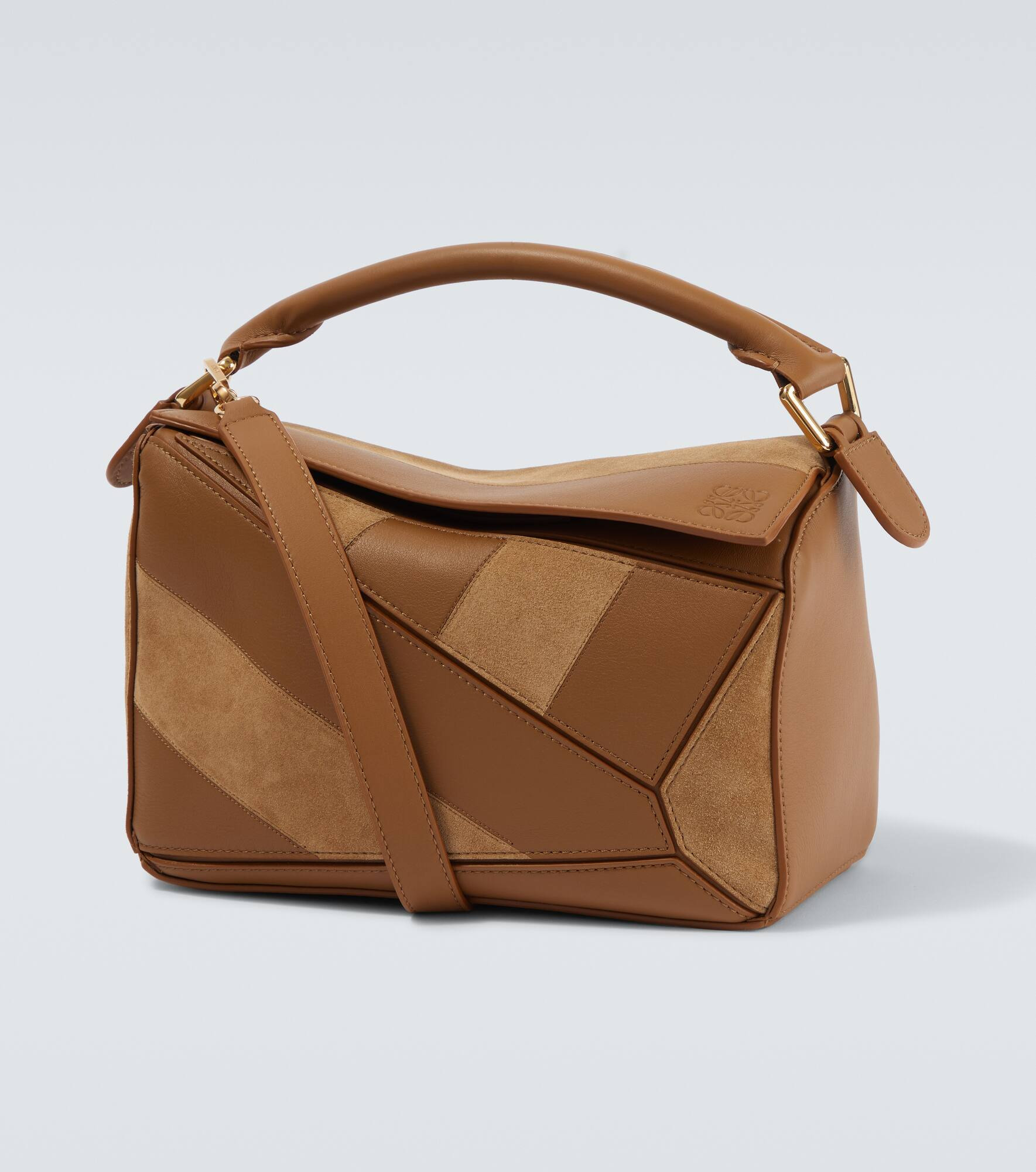 Look no further for a perfect contemporary shoulder bag than the Puzzle Small from Loewe. The brown-hued leather and suede of this piece features an asymmetrical geometrical pattern, adding a touch of modernity to your wardrobe. Product Details - Material: calf leather, calf leather (suede) - Lining: fabric - Made in Spain - Designer color name: Oak - Item color: brown - Hardware color: gold - Top handle, Detachable, adjustable shoulder strap - Closure: zipped top - Internal details: single compartment, internal slot pocket - Zipped back pocket - Item number: P01063404 Size & Fit - Height 16cm-6.5" - Width 24cm-9.5" - Depth 10cm-4" - Length of handles 30cm-12" - Adjustable shoulder strap - Max. length shoulder strap 114cm-45"