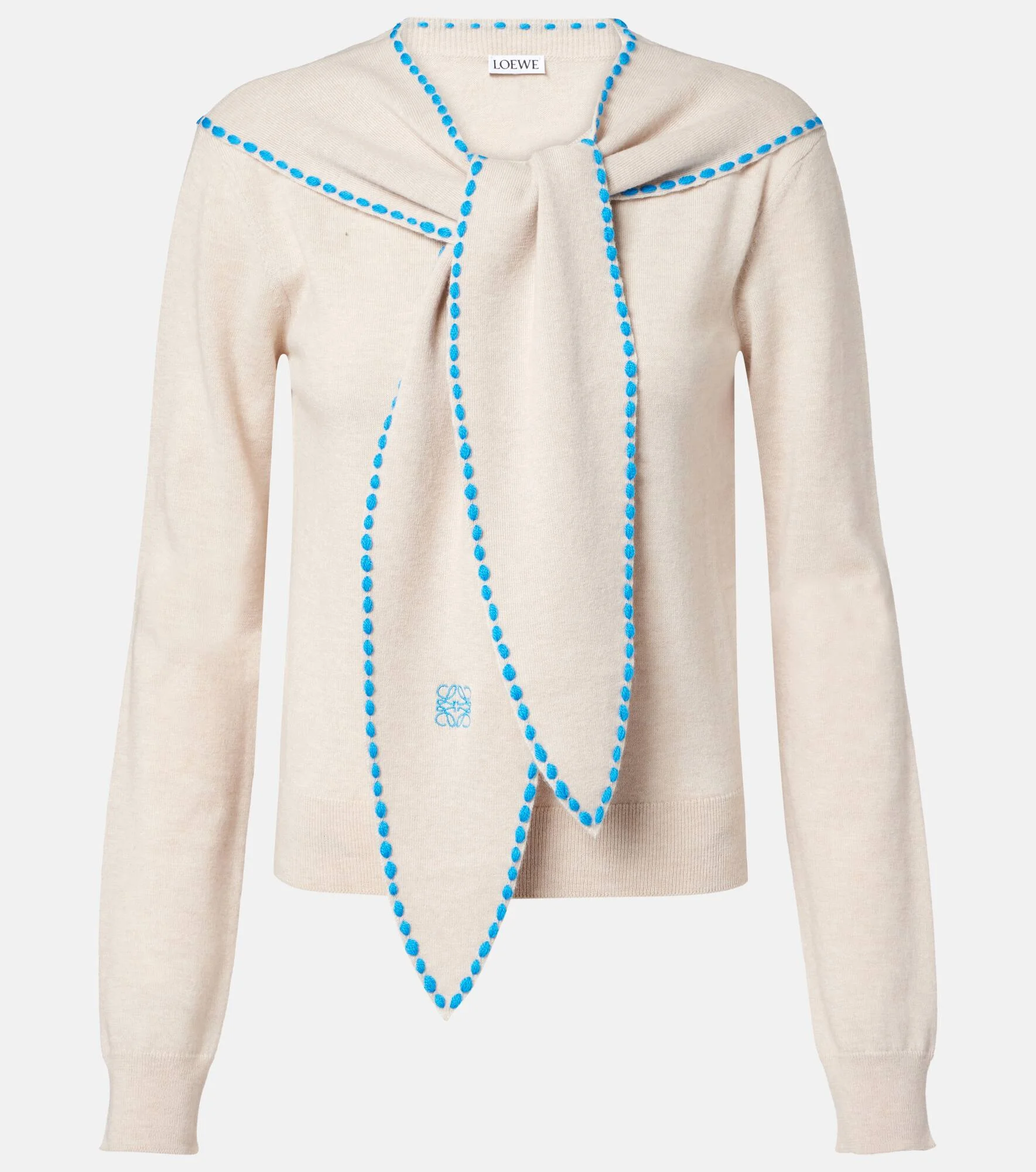 Founded in 1846 as a leathermaking company, Loewe maintains a commitment to art and craft of the utmost quality. Knitted from warm wool yarns, this charming sweater is finished with a cozy scarf detail. Product Details - Material: 99% wool, 1% polyamide - Care instructions: dry clean - Made in Italy - Color: beige - Designer color name: Beige/Blue - Trim: 100% polyester - Details: 100% wool - Hem: ribbed - Item number: P01118253 Size & Fit - True to size - Straight fit - Slightly stretchy fabric - Falls to the hip - The model seen in the picture is 178cm-5'10" and wearing a size XS