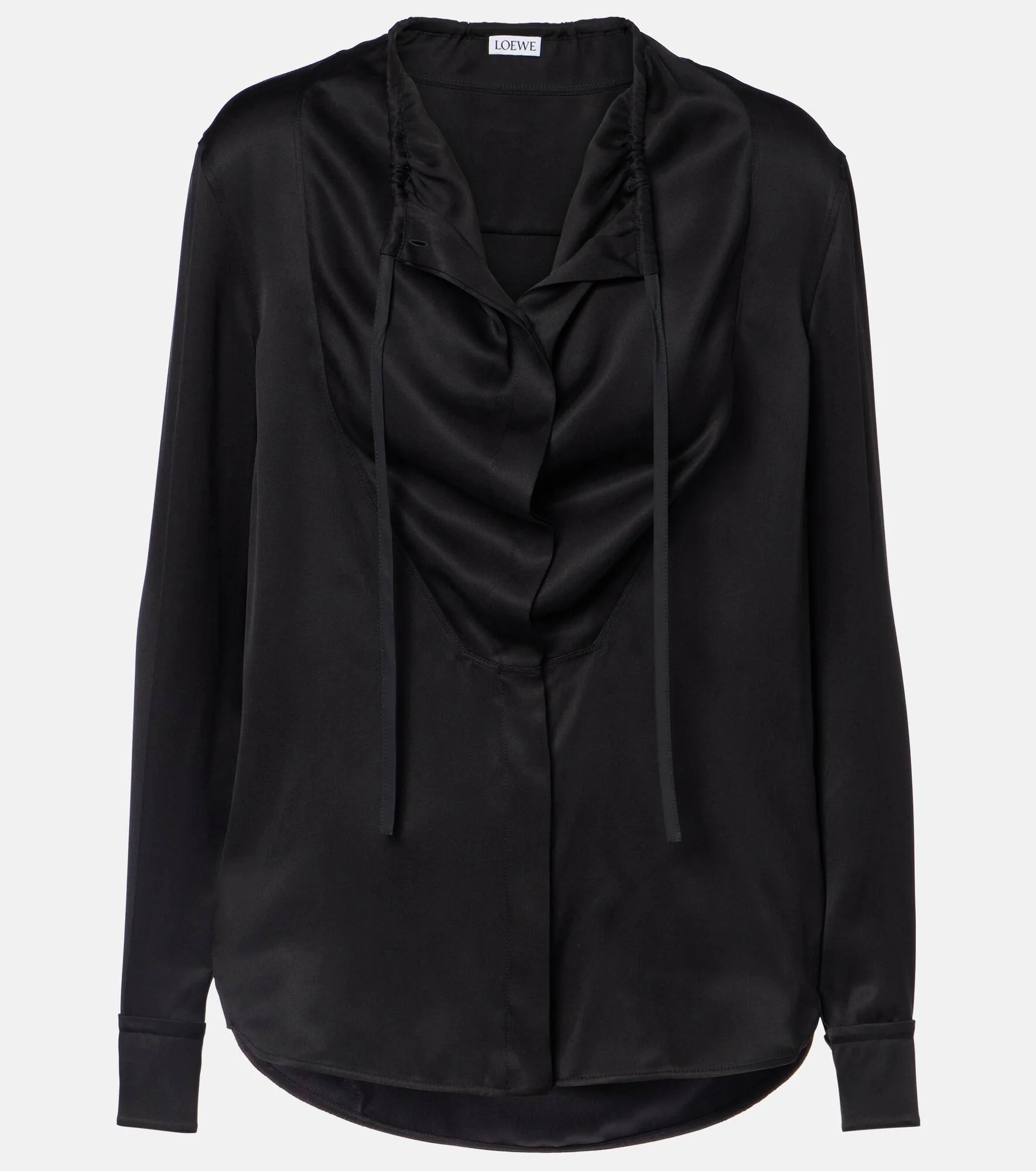 Made from lustrous silk satin, this blouse from Loewe has a minimal yet refined silhouette. The long-sleeve style features a drawstring detail at the neckline to create movement. Product Details - Material: 100% silk - Care instructions: dry clean - Made in Italy - Designer color name: Black - Item color: black - Material II: 100% cotton - Embroidery: 100% polyester - Contains non-textile parts of animal origin - Closure: concealed buttoned front - Self-tie neck - Cuff: buttoned - Item number: P01118362 Size & Fit - True to size - Dropped shoulders - Designed for a loose fit - Non-stretchy fabric - Falls below the hip - The model seen in the picture is 178cm-5'10" and wearing a size FR 34