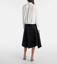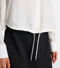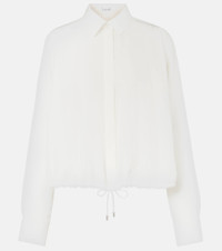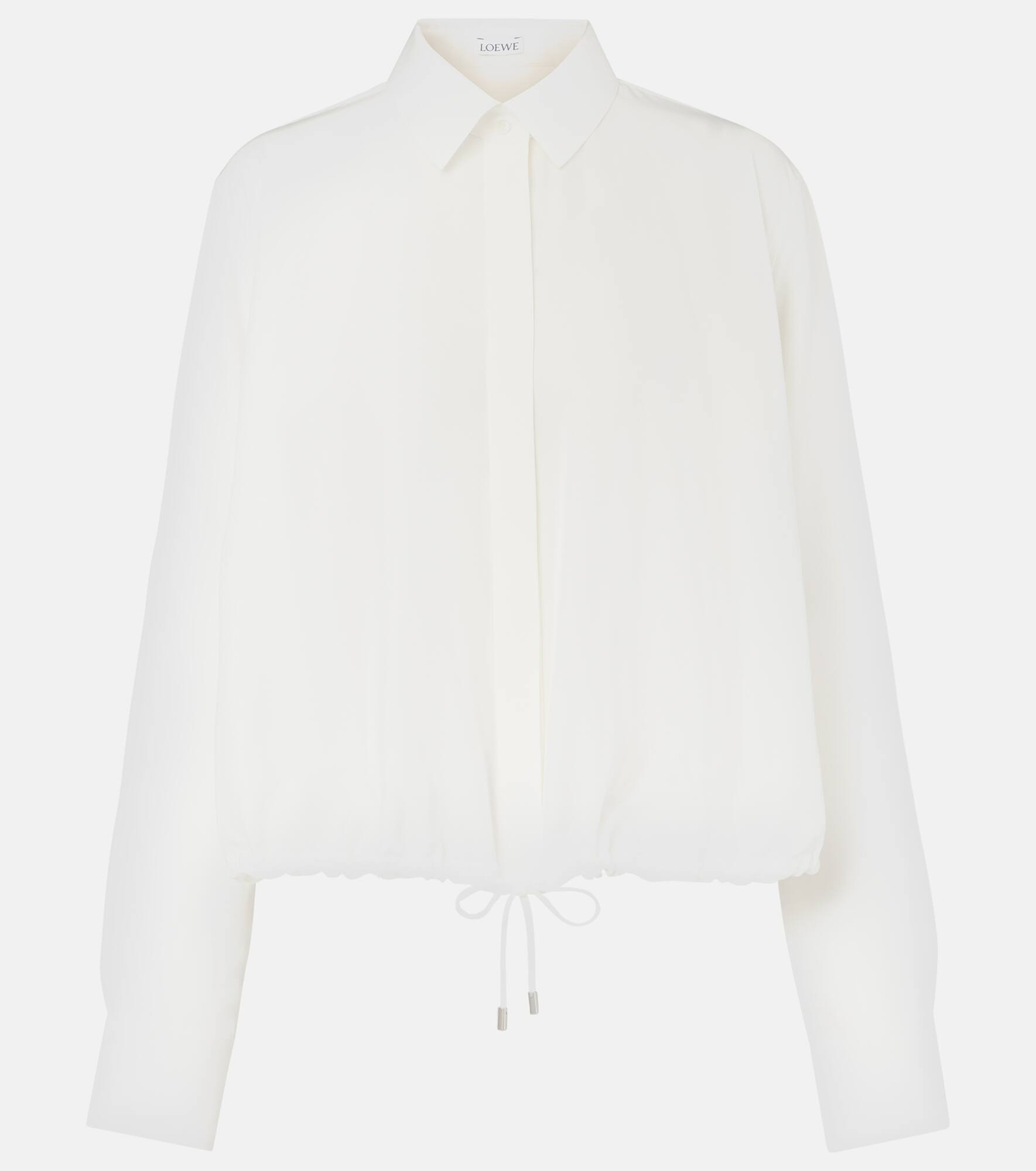 Founded in 1846 as a leathermaking company, Loewe maintains a commitment to art and craft of the utmost quality. Crafted from silk, this top from Loewe features an elegant, relaxed silhouette with a concealed button placket and drawstring hem. Product Details - Material: 100% silk - Care instructions: dry clean - Made in Italy - Designer color name: White - Item color: white - Embroidery: 100% viscose - Collar: classic (Straight point) - Cuff: one button - Closure: concealed buttoned front - Drawstring at the hem for adjustable fit - Contains non-textile parts of animal origin - Item number: P01066168 Size & Fit - True to size - Dropped shoulders - Loose fit, drawstring waist - Non-stretchy fabric - Falls to the hip - The model seen in the picture is 178cm-5'10" and wearing a size FR 34