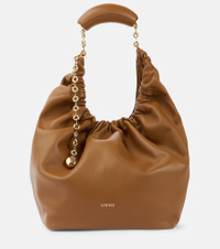 Founded in 1846 as a leathermaking company, Loewe maintains a commitment to art and craft with the utmost quality. Made from brown leather, the Squeeze Medium shoulder bag is defined by its unique gathered shape and golden hardware. Product Details - Material: lamb leather - Lining: suede - Made in Spain - Designer color name: Oak - Internal details: internal zipped pocket - Chain and leather shoulder strap - Closure: magnetic fastening - Comes with dust bag - Item number: P00862573 Size & Fit - Height 32cm-12.5" - Width 25cm-10" - Depth 15cm-6" - Adjustable shoulder strap - Max. length shoulder strap 87cm-34.5"