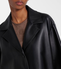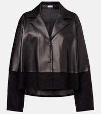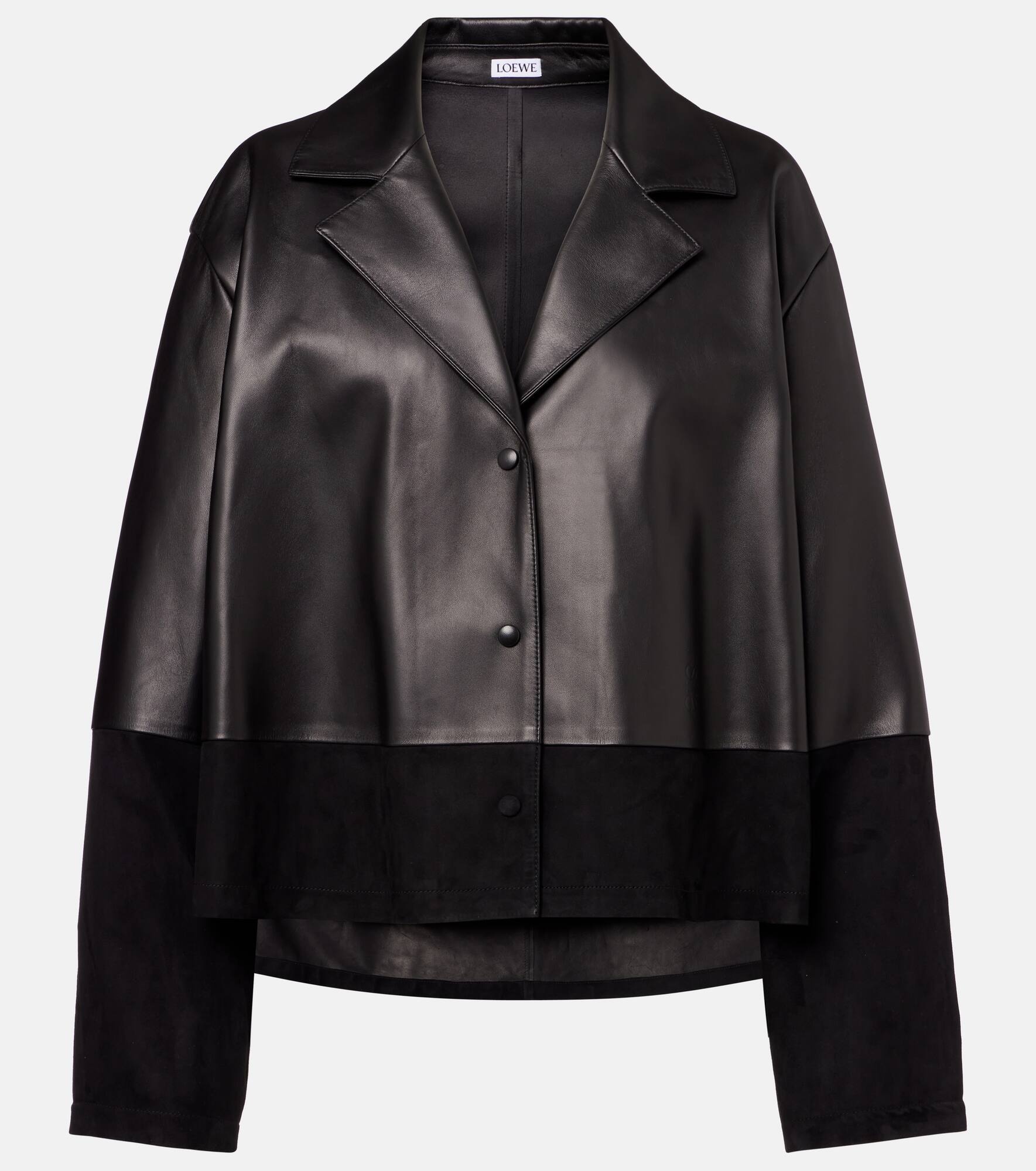 Play with contrast with this captivating, polished leather jacket that is trimmed in tonal suede. All of Loewe's leather goods are handcrafted in Spain, reflecting the house's centuries-long expertise and artisanal methods. Product Details - Material: 100% lamb leather - Care instructions: specialist clean - Made in Spain - Designer color name: Black - Item color: black - Includes: garment bag - Closure: buttoned front - Material II: 100% goat leather (suede) - Item number: P01060940 Size & Fit - True to size - Dropped shoulders - Designed for a loose fit - Non-stretchy fabric - Falls to the hip - The model seen in the picture is 178cm-5'10" and wearing a size FR 36