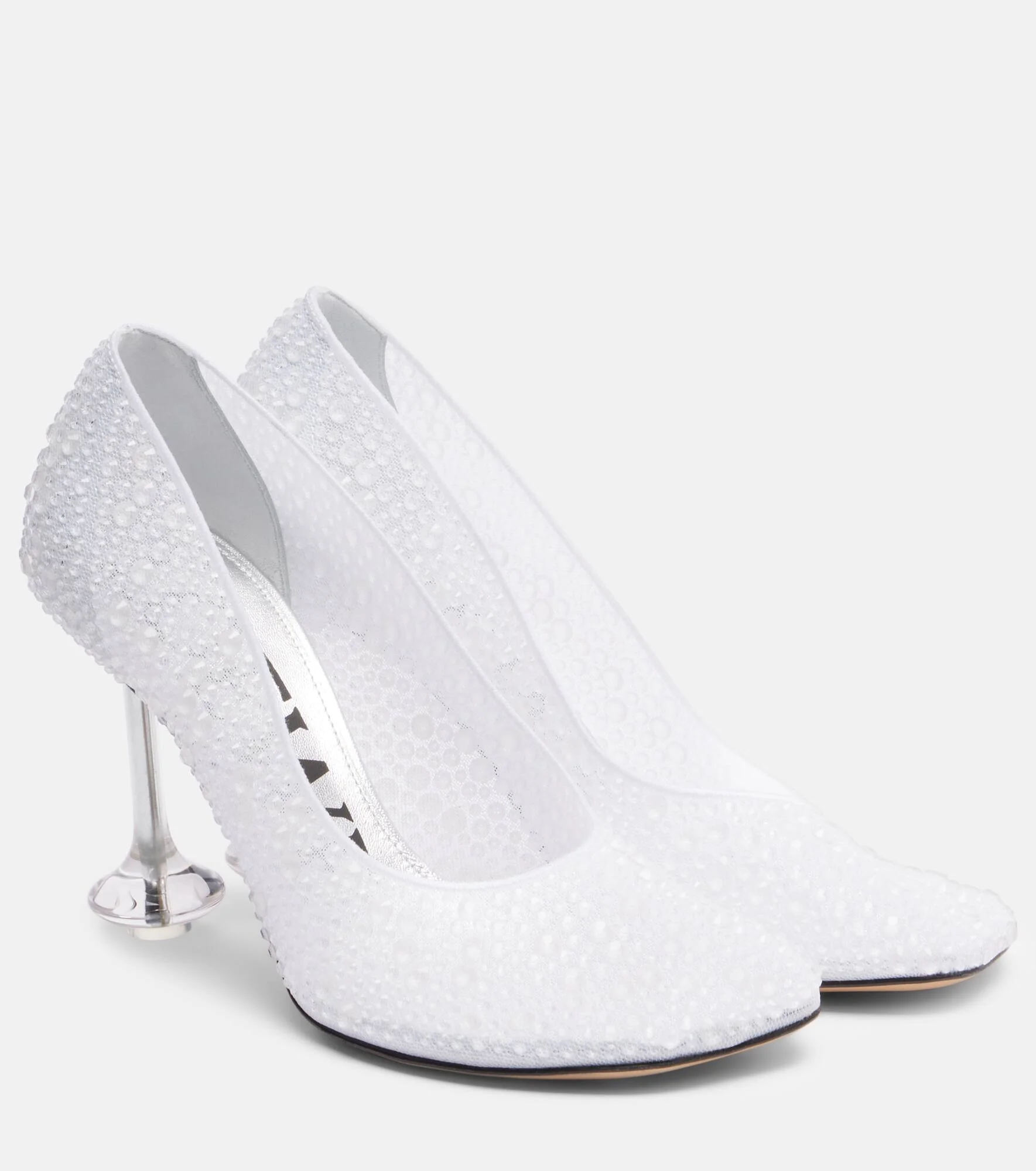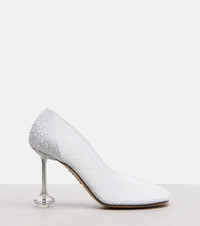 Loewe maintains a commitment to art and craft of the utmost quality. The Toy pumps are made in Italy from mesh with shimmering crystal embellishments and set atop iconic 90mm sculptural heels. Product Details - Upper: rubber, fabric - Lining: fabric, leather - Sole: leather insole and sole - Toe shape: square toe - Made in Italy - Includes: shoe box, dust bag - Designer color name: Transparent - Item color: white - Item number: P01105328 Size & Fit - True to size - European sizes - 9cm-3.5" heel (size EU 38)