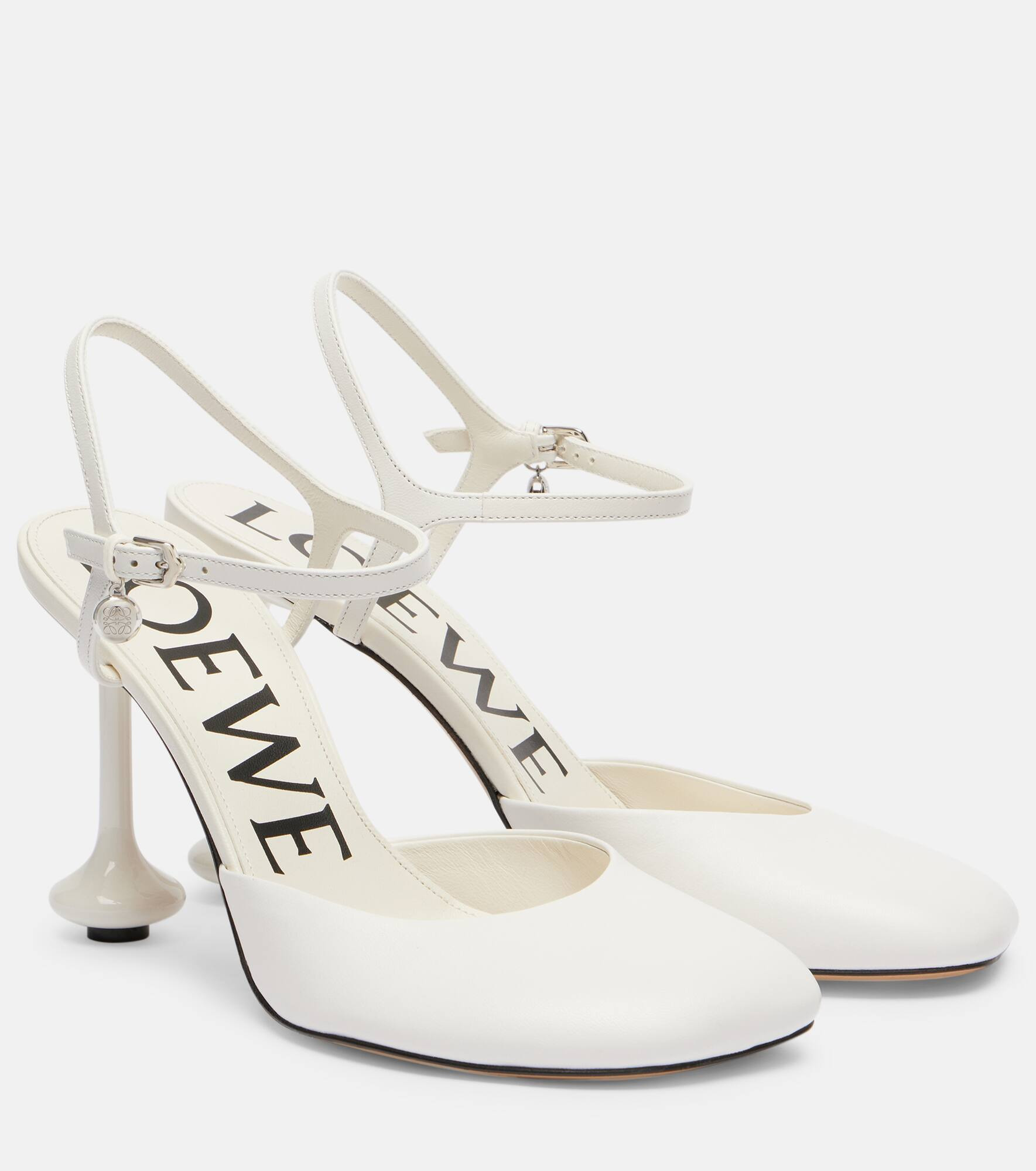 Loewe's signature heels bring playfulness to any look. Made in Italy, these leather pumps rest on 90mm Toy heels and are secured with a strap at the ankle. Product Details - Upper: lamb leather - Lining: leather - Sole: leather insole and sole - Toe shape: square toe - Made in Italy - Includes: shoe box, dust bags - Designer color name: Anthurium White - Item color: white - Item number: P01065985 Size & Fit - True to size - Slightly wide at the toe - Half sizes please take the next size up - European sizes - 9cm-3.5" heel (size EU 38)