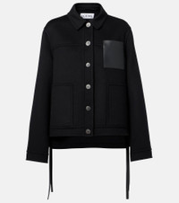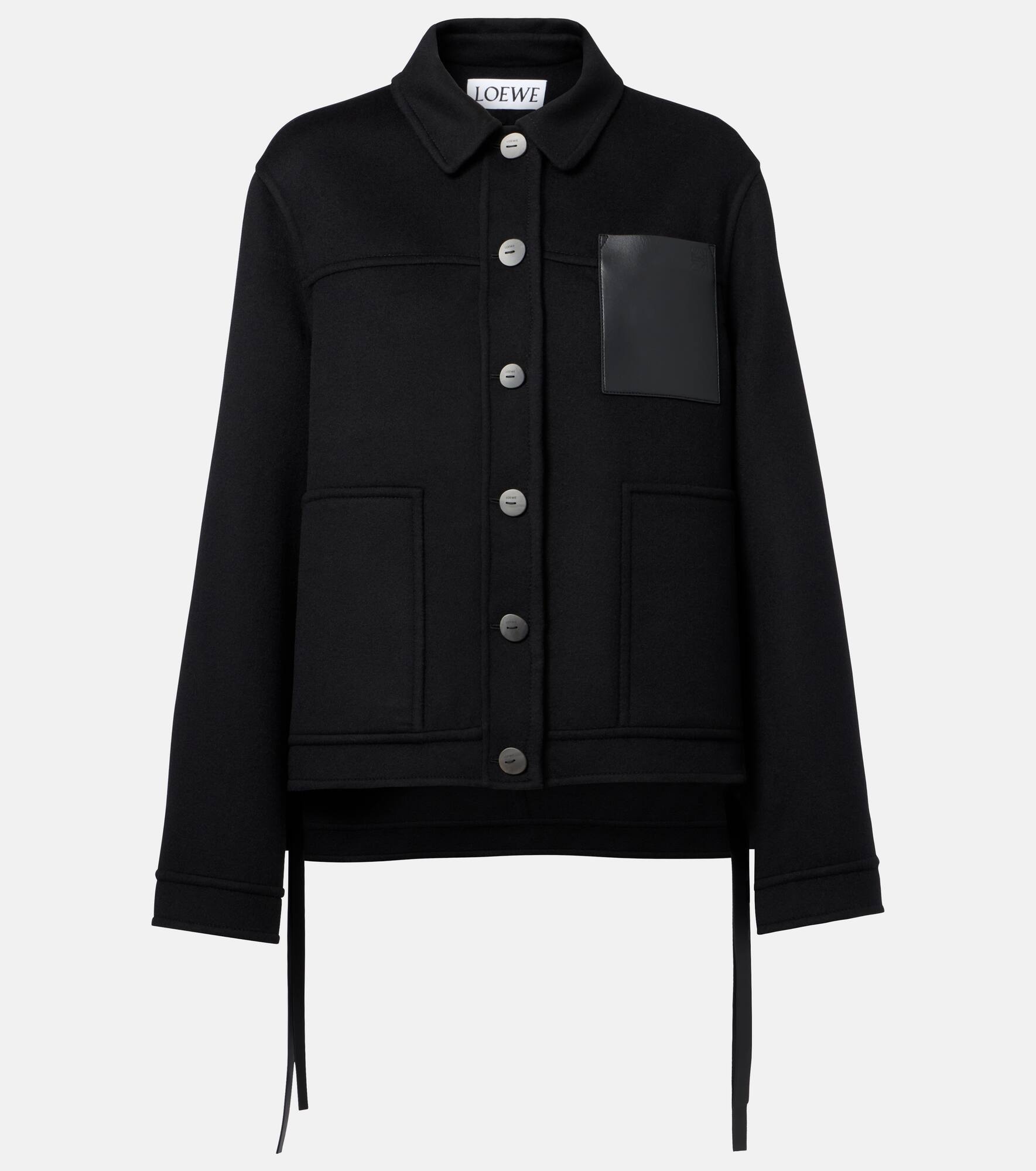 Crafted in double face wool and cashmere, this jacket from Loewe features a charming asymmetric hem with ties at the side. The relaxed fit silhouette is finished with a classic collar, buttoned front, and Anagram embossed leather chest pocket. Product Details - Material: 90% wool, 10% cashmere - Care instructions: dry clean - Made in Italy - Designer color name: Black - Item color: black - Insert: 100% lamb leather - Pockets: patch pockets - Collar: classic (Straight point) - Contains non-textile parts of animal origin - Item number: P01066141 Size & Fit - True to size - Dropped shoulders - Designed for a loose fit - Non-stretchy fabric - Falls to the hip - The model seen in the picture is 178cm-5'10" and wearing a size FR 36