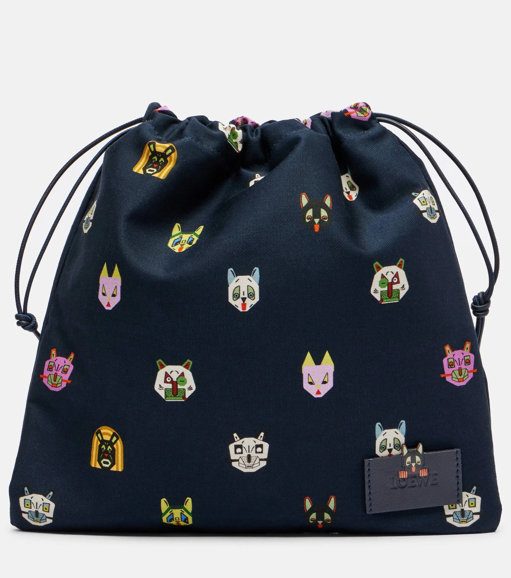 The Cats pouch from Loewe showcases playful motifs inspired by the works of English artist Louis Wain. Crafted from cotton canvas, the style features a drawstring top and leather pulls. Product Details - Material: cotton - Lining: fabric - Made in Spain - Color: blue - Designer color name: Blue/Black - Trim: calf leather - Internal details: single compartment - Closure: drawstring top - Includes: dust bag - Item number: P01163623 Size & Fit - Height 30cm-12" - Width 30cm-12"