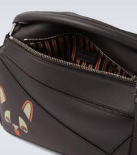 The Puzzle Small tote bag is part of the collaboration between Loewe and Louis Wain. The distinct leather design features motifs inspired by the latter's "Futurist Cats" porcelain vase series. Product Details - Material: calf leather - Lining: cotton - Made in Spain - Color: black - Designer color name: Charcoal - Item color: black - Top handle, Detachable shoulder strap - Internal details: single compartment - Closure: zipped top - Zipped back pocket - Item number: P01123432 Size & Fit - Height 15,5cm-6" - Width 24cm-9.5" - Depth 10cm-4" - Length of handle 32cm-12.5" - Adjustable shoulder strap - Min. length shoulder strap 79cm-31" - Max. length shoulder strap 114cm-45"
