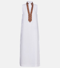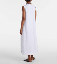 Crafted in Italy from pure linen, the Abril midi dress from Loro Piana showcases a sleeveless style with a striped pattern bordering its V-neckline. This design features a small standing collar and thigh-high slits. Product Details - Material: 100% linen - Care instructions: dry clean - Made in Italy - Designer color name: White - Item color: white - Embroidery: 70% cotton, 30% polyester - Collar: V-neck - Side slits - Item number: P01060878 Size & Fit - True to size - Designed for a loose fit - Non-stretchy fabric - The model seen in the picture is 178cm-5'10" and wearing a size IT 40