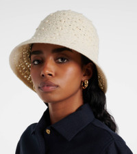 Every Loro Piana design combines the best of Italian craftsmanship with the finest raw materials. Showcasing the brand's dedication to unmatched quality, the Arola bucket hat is a timeless addition to your accessories rotation. This style is crocheted from a blend of cashmere, nylon, and abaca – a fiber made from banana leaves that ensures a natural, hard-wearing finish. Product Details - Material: 54% cashmere, 30% nylon, 16% other fibres - Care instructions: hand wash - Made in Italy - Designer color name: Nougat - Item number: P00997206 Size & Fit - Circumference size S 56cm-22" - Circumference size M 58cm-23" - Circumference size L 60cm-23.5" - Width of brim 6,5cm-2.5"