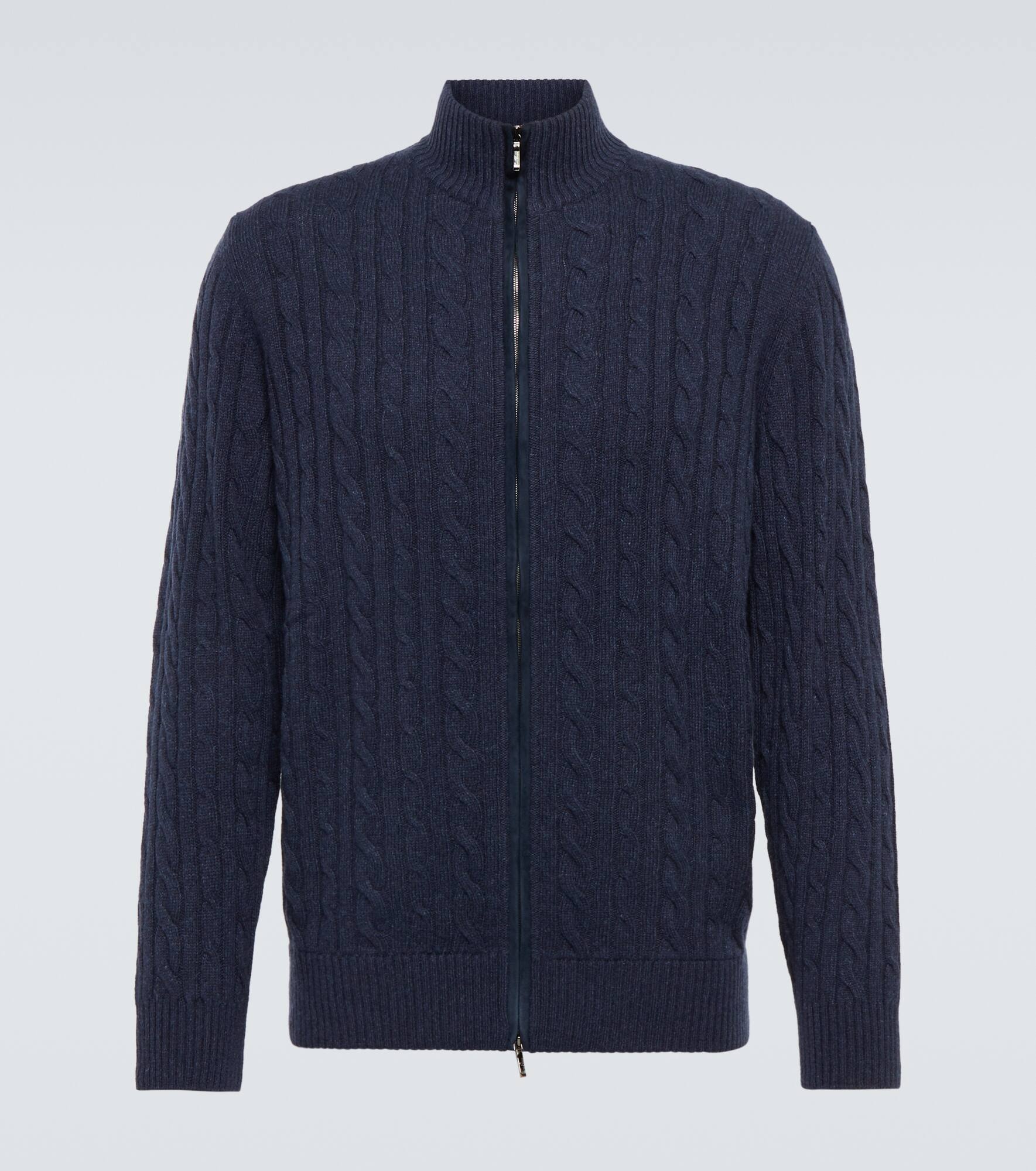 Crafted from pure baby cashmere, this relaxed-fit cardigan from Loro Piana features an all-over cable knit design and comes in a classic navy blue hue. Product Details - Material: 100% cashmere - Care instructions: hand wash - Made in Italy - Designer color name: Blue Corsaro M/Dark Slate Blue - Closure: zipped front - Item number: P00794872 Size & Fit - True to size - Straight fit - Mid-weight material - Falls to the hip - The model in the picture is 185cm-6'1" and wearing a size IT 48