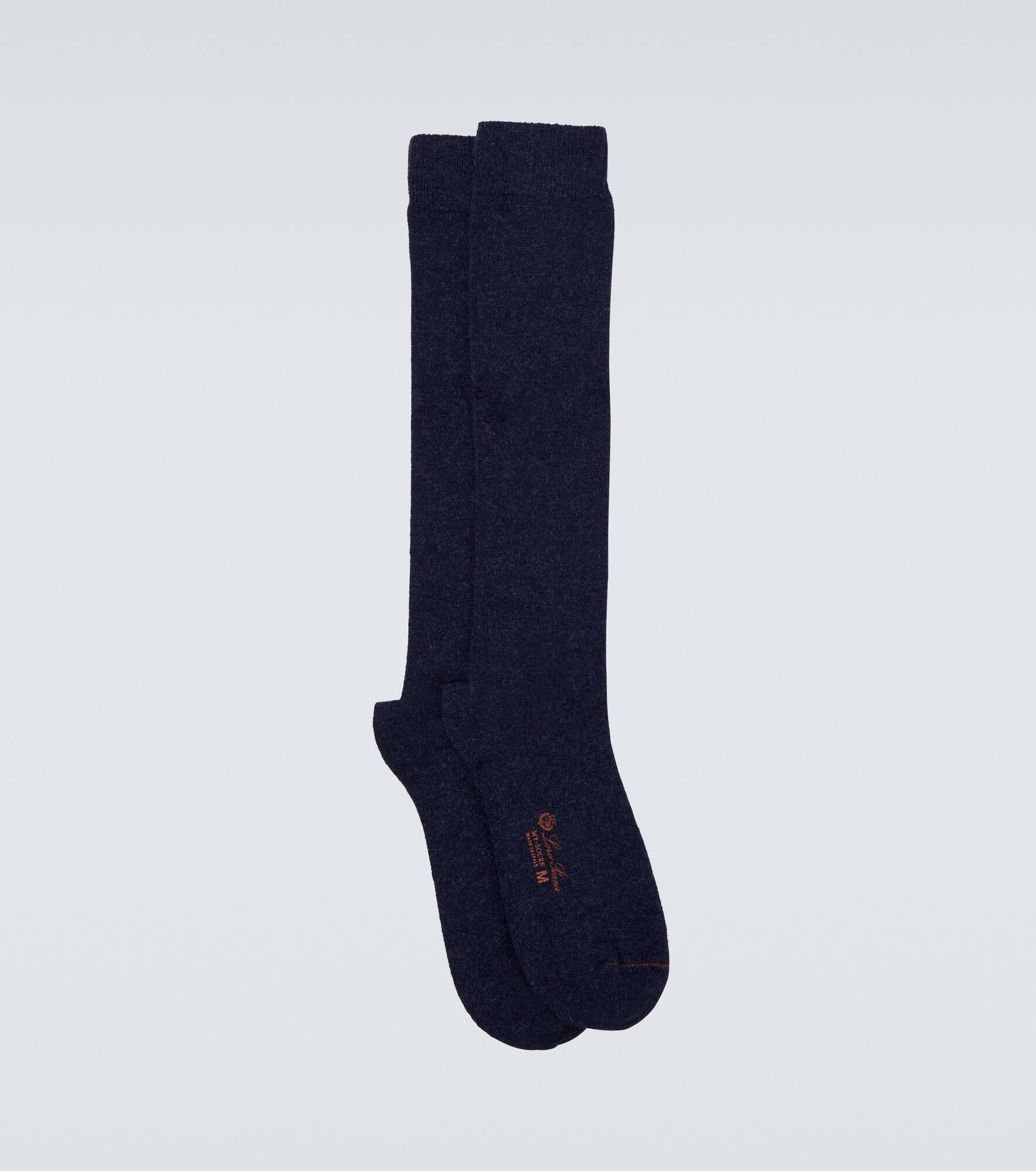 Crafted from the softest yarns, Loro Piana's socks are luxurious and incredibly comfortable. This versatile over-the-calf design is made from a fine cashmere blend in a blue mélange. Product Details - Care instructions: machine wash at 30 degrees - Material: 97% cashmere, 3% elastane - Made in Italy - Item number: P00690018 Size & Fit - Length of size S = 22cm-8.5" - Length of size M = 25cm-10" - Length of size L = 27cm-10.5" - Length of size XL = 28cm-11"