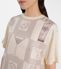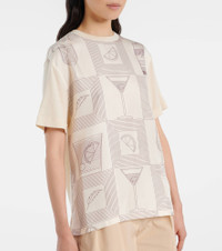 Expertly crafted in Italy from lightweight silk jersey, the Mazzorbo T-shirt from Loro Piana exudes casual elegance. The style features a charming aperitivo print, short sleeves, a classic crewneck, and ribbed trims for a refined finish. Product Details - Material: 100% silk - Care instructions: dry clean - Made in Italy - Designer color name: Ivory/Plum Purple - Item color: beige, purple - Material II: 62% silk, 38% cotton - Trim: 47% silk, 28% cotton, 23% polyamide, 2% elastane - Collar: crewneck - Side slits - Item number: P01060906 Size & Fit - True to size - Dropped shoulders - Designed for a loose fit - Partly stretchy fabric - Falls below the hip - Height of model is 178cm-70" and wears a size XS