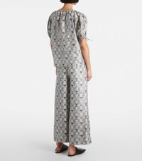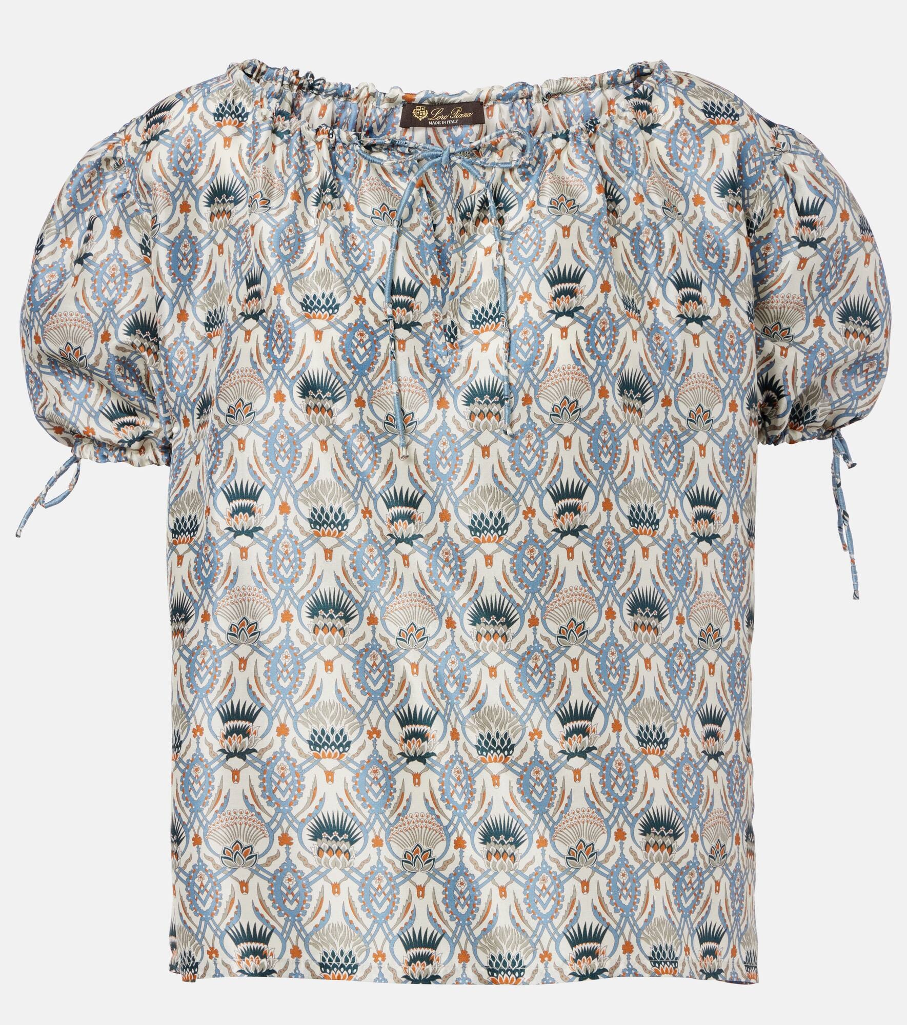 Every Loro Piana design combines the best of Italian craftsmanship with the finest raw materials. Meticulously made from Cardo Veneziano silk, the Rose top is enriched with intricate motifs and drawstring detailing at the sleeves and neckline. Product Details - Material: 100% silk - Care instructions: dry clean - Made in Italy - Designer color name: Chalk/Deep Lagoon Wa - Item color: multicolor - Closure: drawstring - Cuff: ruffled - Item number: P01060881 Size & Fit - True to size - Designed for a loose fit - Non-stretchy fabric - Falls to the hip - The model seen in the picture is 178cm-5'10" and wearing a size IT 40