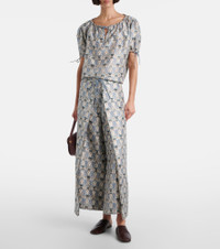 Rose printed puff-sleeve silk top