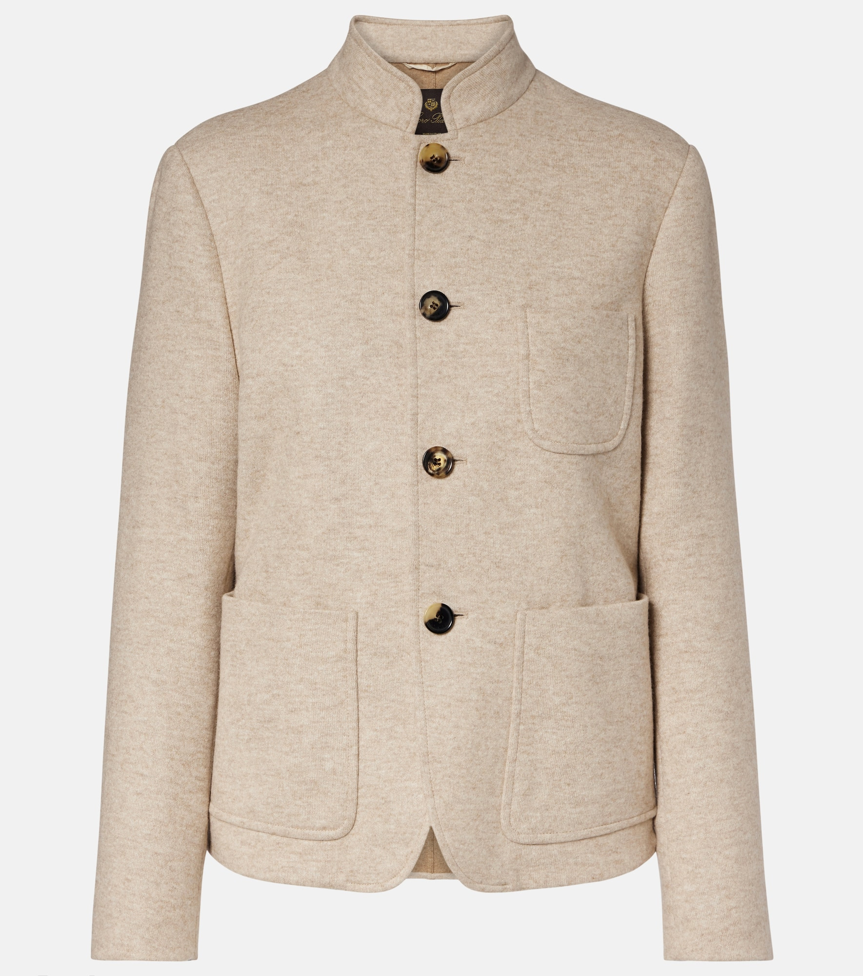 Every Loro Piana design combines the best of Italian craftsmanship with the finest raw materials. Made from a soft cashmere-blend material, the Spagna Mini jacket is a single-breasted piece with patch pockets and a standing collar. Product Details - Material: 96% cashmere, 4% polyamide - Care instructions: dry clean - Made in Italy - Designer color name: Kasha Melange - Item color: beige - Sleeve lining: 100% cupro - Closure: buttoned front - Pockets: patch pockets - Contains non-textile parts of animal origin - Item number: P01069532 Size & Fit - True to size - Straight fit - Non-stretchy fabric - Falls to the hip - The model seen in the picture is 178cm-5'10" and wearing a size IT 40