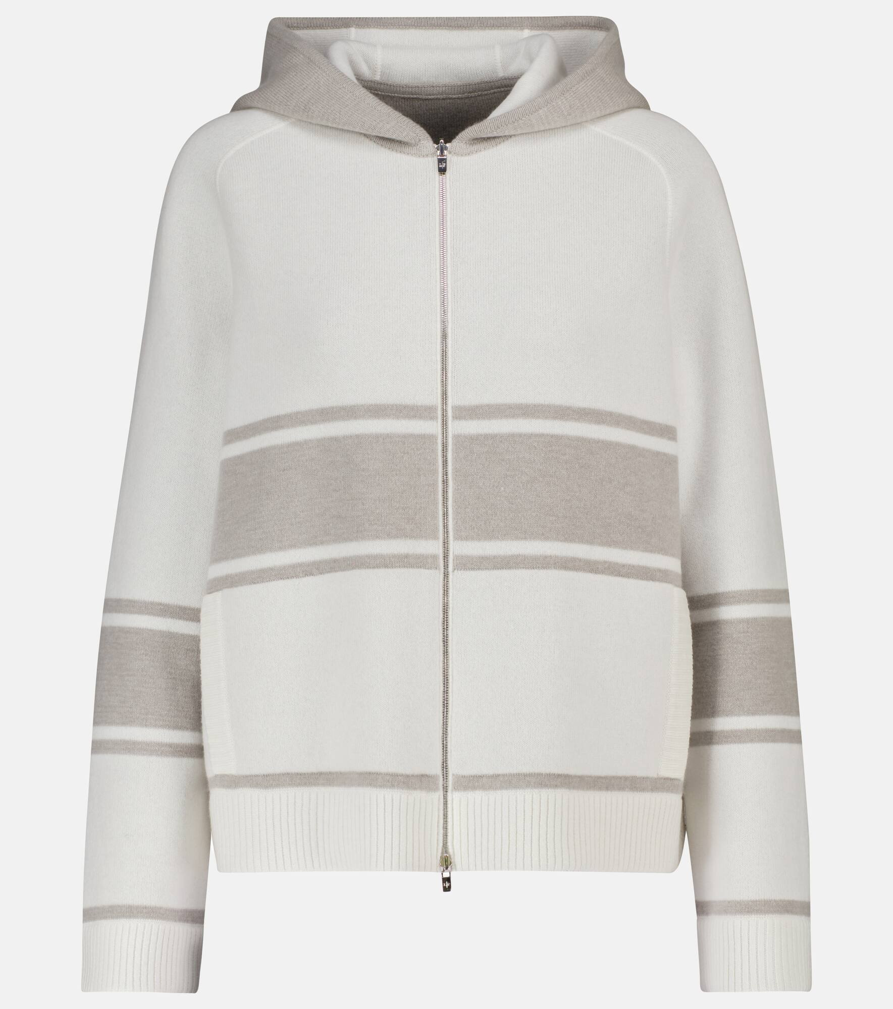 Loro Piana's Thompson striped hoodie proves the label's off-duty design doesn't compromise on signature elegance and superior fabrications. The reversible piece is made from soft cashmere exclusively sourced from baby Hircus goats – a process that has been finessed by the brand for over a decade. This neutral cream-white shade invites comfort. Product Details - Made in Italy - Material: 100% cashmere - Pockets: side slit pockets - Designer color name: Beige - Hood - Closure: zipped front - Care instructions: hand wash - Item number: P00514245 Size & Fit - True to size - Designed for a loose fit - Mid-weight material - Falls to the hip - The model seen in the picture is 178cm-5'10" and wearing a size IT 40