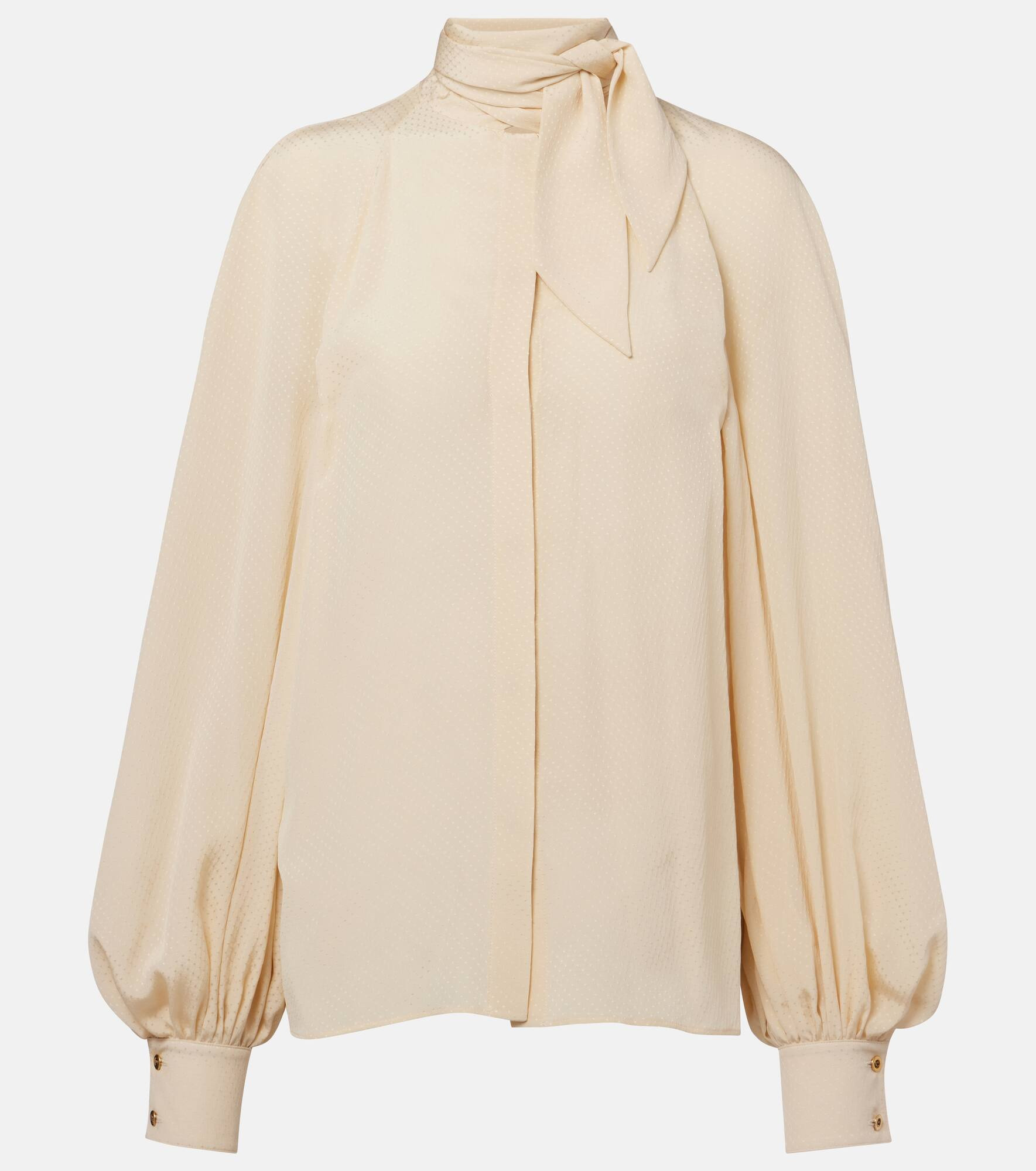 Product Details - Material: 100% silk - Care instructions: dry clean - Made in Italy - Designer color name: Creamy Vanilla - Item color: beige - Self-tie neck - Closure: concealed buttoned front - Cuff: two buttons - Item number: P01069278 Size & Fit - True to size - Designed for a loose fit - Non-stretchy fabric - Falls to the hip - The model seen in the picture is 178cm-5'10" and wearing a size IT 40