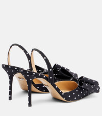 The Le Cadeau satin pumps from Mach & Mach exude timeless sophistication, bringing a Parisian aesthetic with their polka-dot pattern and charming bows. Their design is complete with pointed toes and 85mm stiletto heels. Product Details - Upper: fabric - Lining: leather - Sole: leather insole and sole - Toe shape: pointed toe - Made in Italy - Includes: dust bag, shoe box - Designer color name: Black/White - Item color: black - Item number: P01044032 Size & Fit - True to size - European sizes - 9cm-3.5" heel (size EU 38)