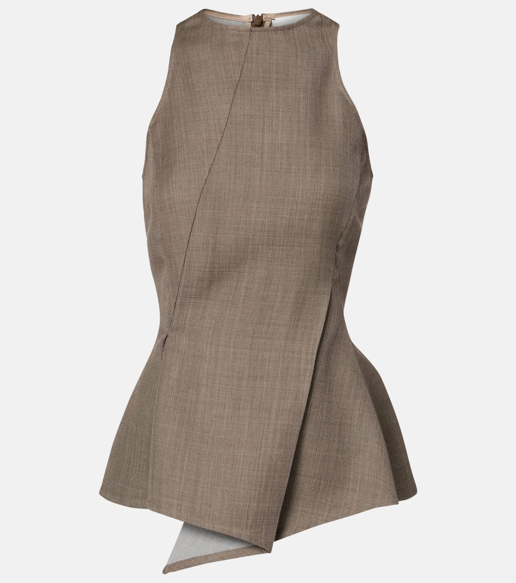 Magda Butrym aims to empower with sharp modern style, expertly delivered through artisanal excellence. Crafted from pure wool, this sleeveless top showcases a voluminous peplum silhouette with an asymmetric hemline. Product Details - Material: 100% wool - Care instructions: dry clean - Made in Poland - Color: beige - Designer color name: Beige - Item color: beige - Closure: concealed zipped back - Item number: P01130925 Size & Fit - True to size - Cinched waist - Non-stretchy fabric - Falls below the hip - The model seen in the picture is 178cm-5'10" and wearing a size FR 36
