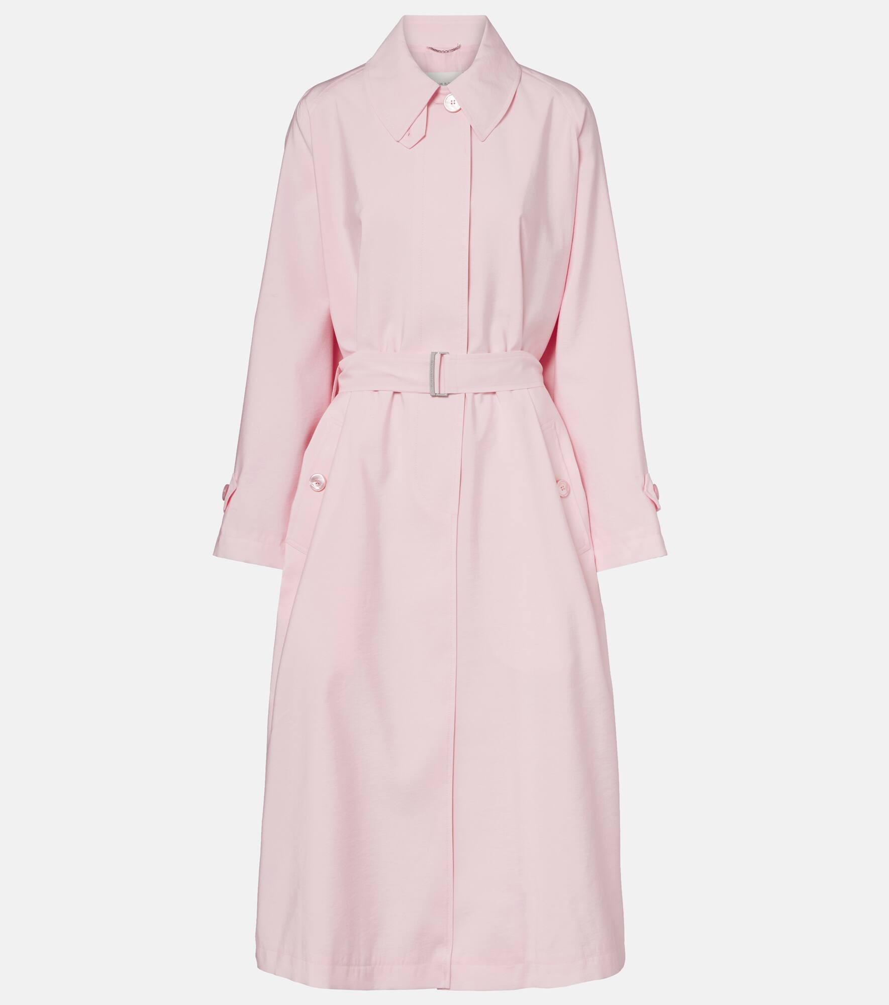 Magda Butrym aims to empower with sharp modern style, expertly delivered through artisanal excellence. This trench coat is designed with a belted waist, and the refined collar features a detachable strap. Product Details - Material: 85% modal, 15% polyester - Care instructions: dry clean - Made in Poland - Designer color name: PInk - Item color: pink - Detachable belt - Cuff: strapped - Pockets: buttoned pockets - Closure: buttoned front - Item number: P01086721 Size & Fit - True to size - Loose fit, comes with belt - Non-stretchy fabric - The model seen in the picture is 178cm-5'10" and wearing a size FR 36