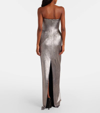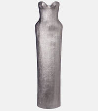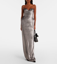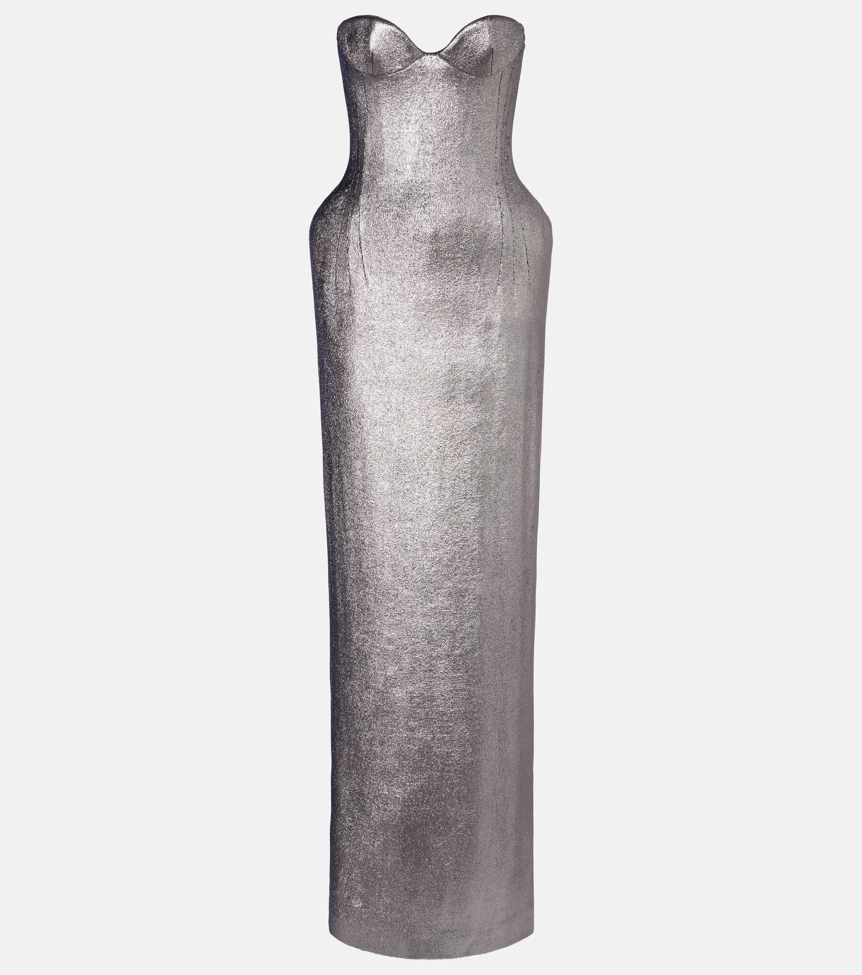 This elegant bustier gown from Magda Butrym is made for the spotlight. The silver-toned piece boasts a fitted, strapless silhouette with a sweetheart neckline, adding a touch of allure to any special occasion. Product Details - Material: 86% viscose, 13% polyamide, 1% elastane - Care instructions: dry clean - Made in Poland - Designer color name: Silver - Item color: silver - Lining: 90% silk, 10% elastane - Closure: zipped back - Hook-fastening built-in bustier - Boning - Padded cups - Long vent - Item number: P01086739 Size & Fit - True to size - Strapless - Internal corset with underwire support - Fitted - Slightly stretchy fabric - slit length 78,0cm-30.5" - Height of model is 174cm-68.5" and wears a size FR 36