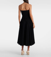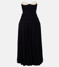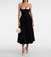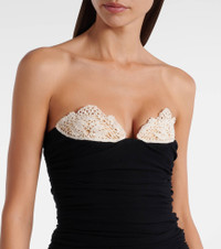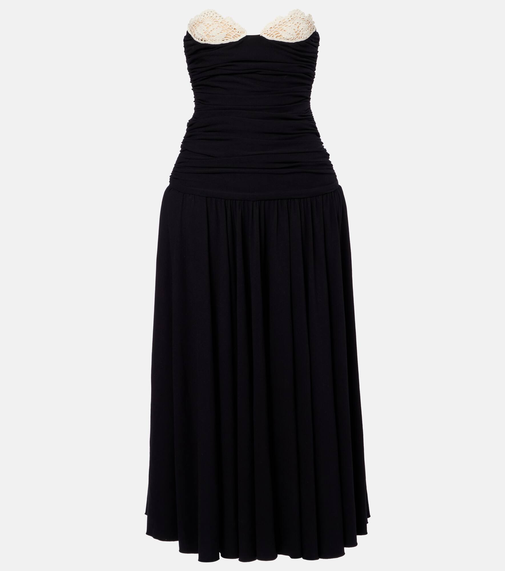 Magda Butrym aims to empower with sharp modern style, expertly delivered through artisanal excellence. This cocktail dress is made with jersey and features lace crocket-trimming on the strapless bustier and a dramatic drop waist. Product Details - Material: 95% viscose, 5% elastane - Care instructions: dry clean - Made in Poland - Designer color name: Black - Item color: black, white - Hook-fastening built-in bustier - Underwired cups - Closure: zipped back - Item number: P01083699 Size & Fit - True to size - For a closer fit, we recommend taking one size down - Internal boned corset for support - Fitted bodice, loose skirt - Stretchy fabric - Padded top - The model seen in the picture is 178cm-5'10" and wearing a size FR 36