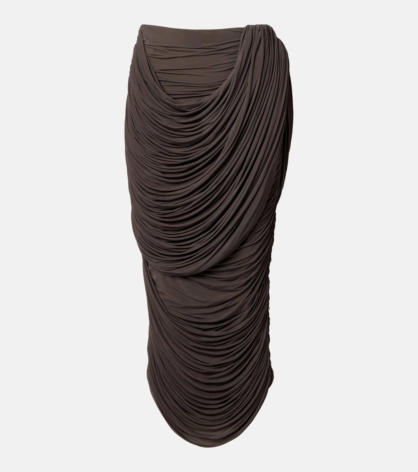 Magda Butrym aims to empower with sharp modern style, expertly delivered through artisanal excellence. This skirt is cut from fluid jersey with refined draping and a midi length for a sublime balance of softness and structure. Product Details - Material: 92% cupro, 8% elastane - Care instructions: dry clean - Made in Poland - Color: brown - Designer color name: Brown - Elasticated waistband - Item number: P01130913 Size & Fit - True to size - Elasticated waist - Stretchy fabric - High-waisted - The model seen in the picture is 178cm-5'10" and wearing a size FR 36