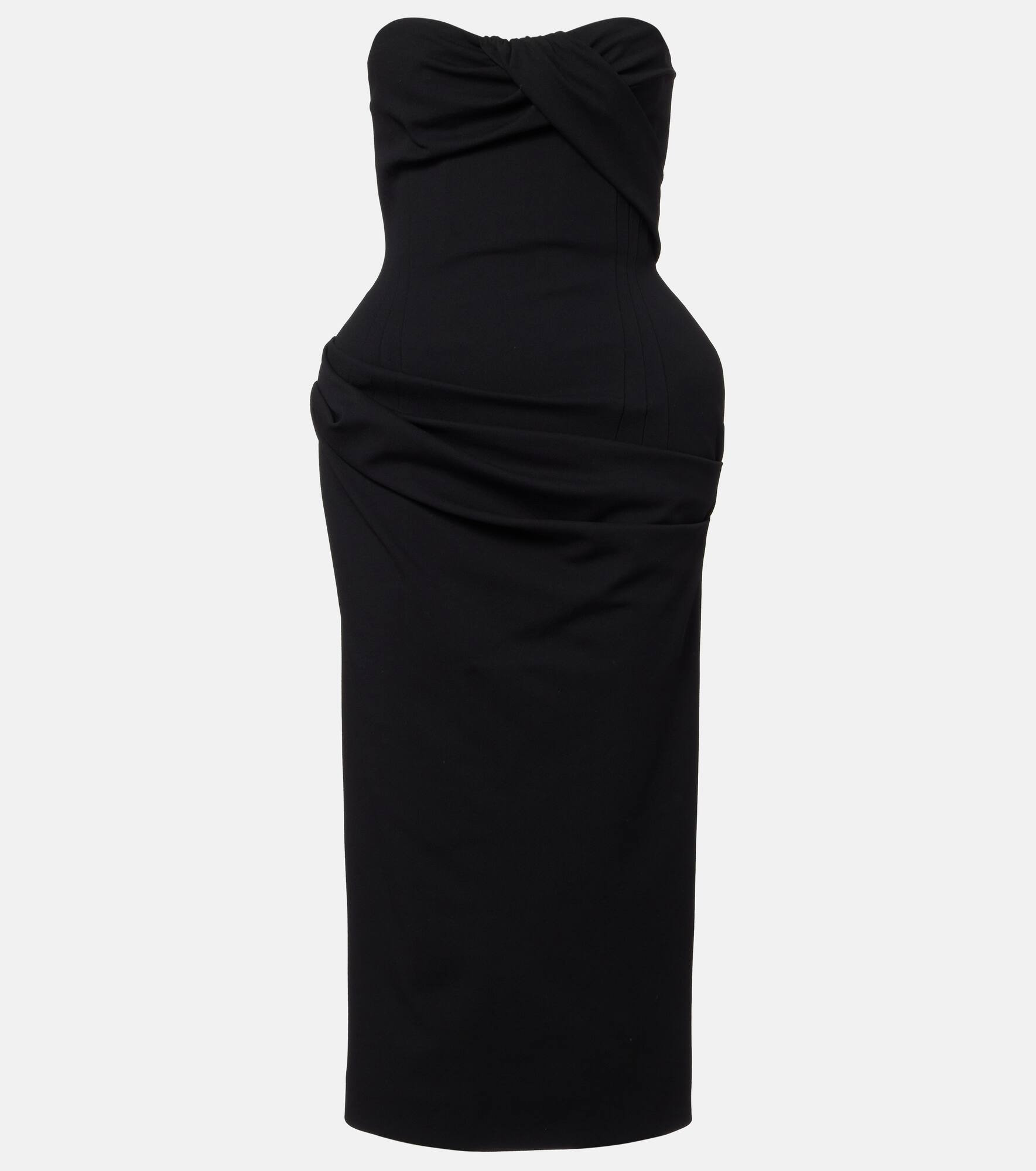 Shaking up the industry with its biting modernity and artisanal excellence, Magda Butrym exists to empower. This strapless midi dress is designed with a draped silhouette, and its built-in bustier gives structure and elegance to the ensemble. Product Details - Material: 78% viscose, 17% polyamide, 5% elastane - Care instructions: dry clean - Made in Poland - Designer color name: Black - Item color: black - Lining: 90% silk, 10% elastane - Closure: invisible zipper - Hook-fastening built-in bustier - Item number: P01086747