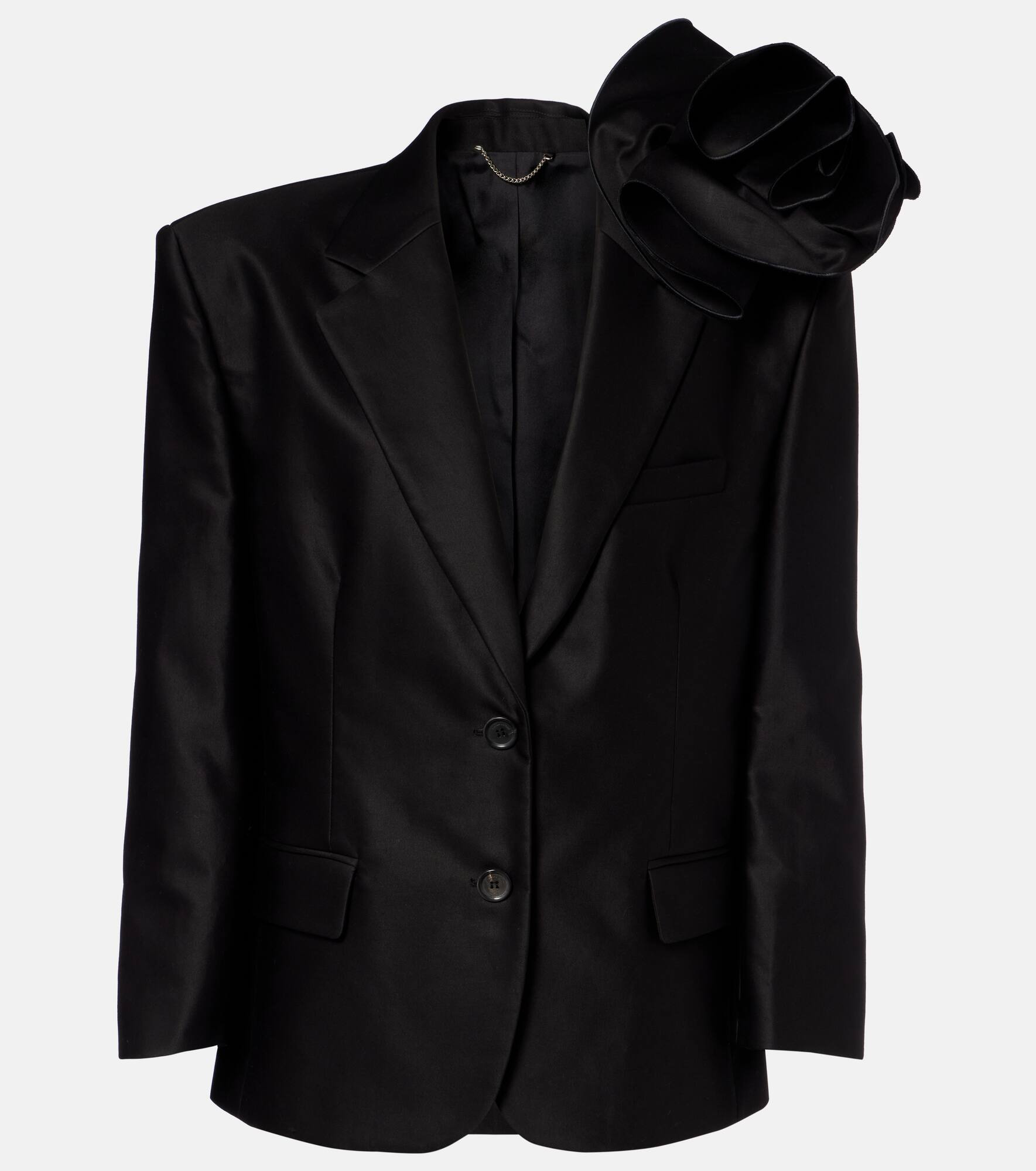 Topped with a rosette, this blazer is crafted from lightweight cotton into a relaxed, single-breasted silhouette. Floral appliques have become something of a Magda Butrym signature, appearing artfully on the brand's most coveted designs. Product Details - Material: 100% cotton - Care instructions: dry clean - Made in Poland - Designer color name: Black - Item color: black - Lining: 100% silk - Notched lapel - Shoulder pads - Closure: single-breasted (two buttons) - Cuff: four buttons - Pockets: ticket pocket, flap pockets, internal pockets - Vent: double - Fully lined - Includes: brooch - Item number: P01083321 Size & Fit - True to size - Shoulder pad inserts - Designed for a loose fit - Non-stretchy fabric - Falls below the hip - The model seen in the picture is 178cm-5'10" and wearing a size FR 36