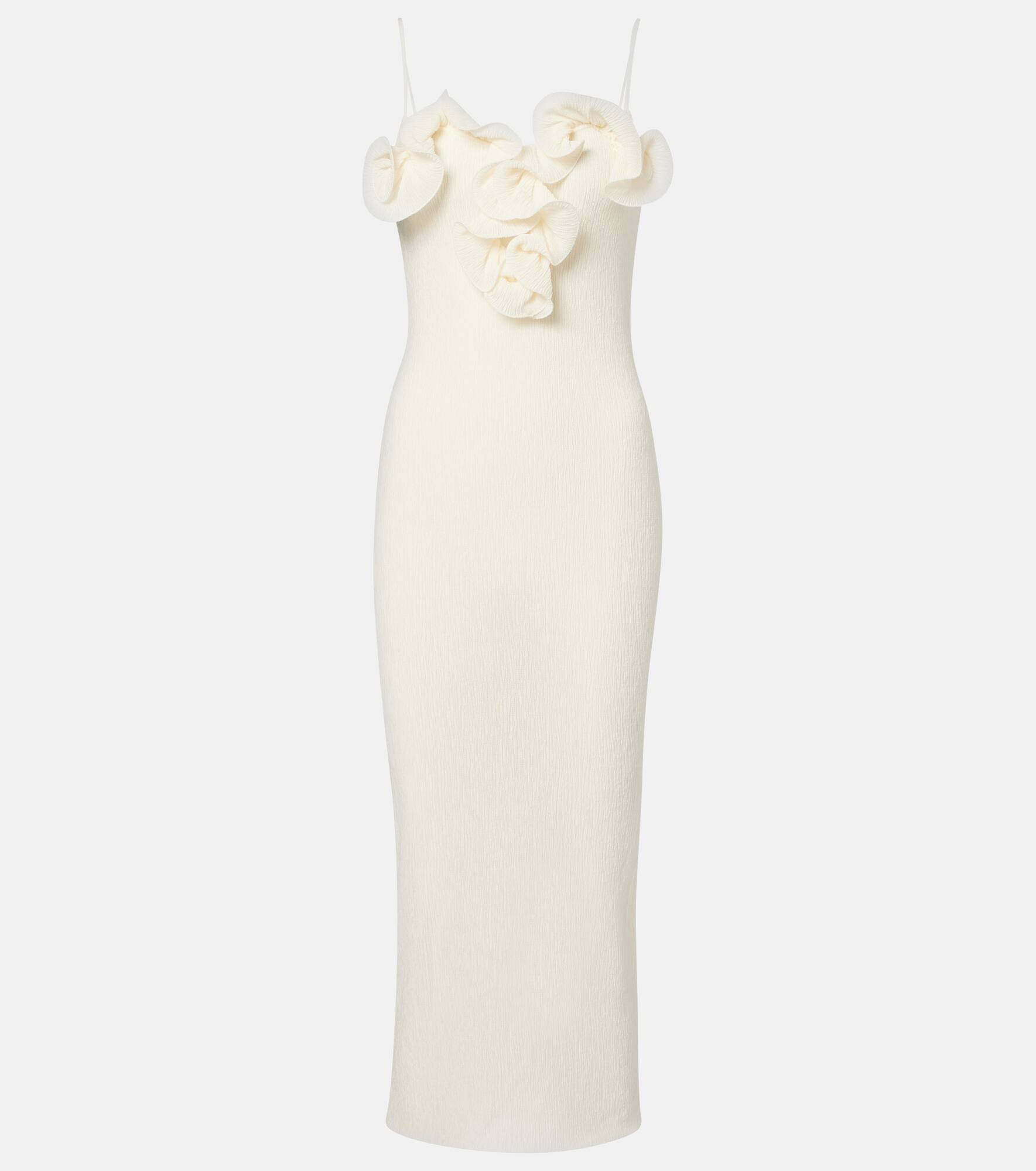 Floral appliques have become something of a Magda Butrym signature, appearing artfully on this elegant midi dress. Crafted from white crepe fabric, this style features a deep neckline and is suspended on thin spaghetti straps. Product Details - Material: 59% lyocell, 40% polyester, 1% elastane - Care instructions: dry clean - Made in Poland - Designer color name: Cream - Item color: white - Item number: P01083644 Size & Fit - True to size - Semi-sheer - Fitted - Stretchy fabric - slit length 51,0cm-20" - The model seen in the picture is 178cm-5'10" and wearing a size FR 36