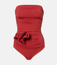 Flower appliqué strapless draped swimsuit in red