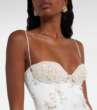 Magda Butrym aims to empower with sharp modern style, expertly delivered through artisanal excellence. This crochet-trimmed slip dress is made from pure silk featuring a floral print. Product Details - Material: 100% silk - Care instructions: dry clean - Made in Poland - Designer color name: Cream - Item color: multicolor - Lining: 100% silk - Padded cups - Closure: invisible zipper - Item number: P01083654 Size & Fit - True to size - Ideal fit for larger bust sizes - Cinched waist - Non-stretchy fabric - Padded top - slit length 43,0cm-17" - The model seen in the picture is 178cm-5'10" and wearing a size FR 36