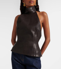 Magda Butrym aims to empower with sharp modern style, expertly delivered through artisanal excellence. This top is cut from grained lamb leather to a halterneck silhouette and finished with seamed panels along the sides. Product Details - Material: 100% lamb leather - Care instructions: specialist clean - Made in Poland - Color: brown - Designer color name: Brown - Item color: brown - Lining: 100% viscose - Closure: buttoned back, zipped back - Hardware color: silver - Item number: P01130906 Size & Fit - Fits large to size - we recommend trying one size smaller - Low back - Cinched waist - Non-stretchy fabric - Falls to the hip - The model seen in the picture is 178cm-5'10" and wearing a size FR 36