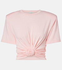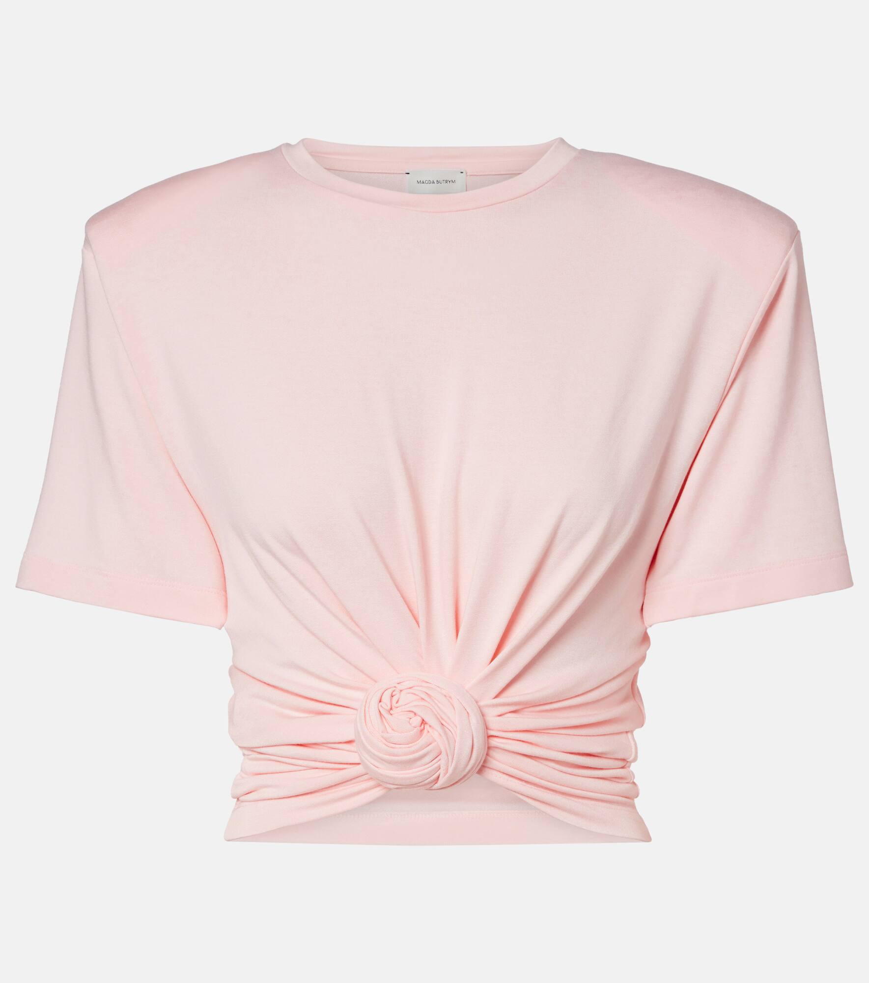 Shaking up the industry with its biting modernity and artisanal excellence, Magda Butrym exists to empower. Made from soft jersey, this T-shirt is defined by a signature front knot that cinches the waist, creating a flattering silhouette. Product Details - Material: 97% viscose, 3% elastane - Care instructions: dry clean - Made in Poland - Designer color name: Pink - Item color: pink - Collar: crewneck - Detachable shoulder pads - Item number: P01086761 Size & Fit - True to size - Shoulder pad inserts - Cinched waist - Stretchy fabric - Cropped - The model seen in the picture is 178cm-5'10" and wearing a size FR 36