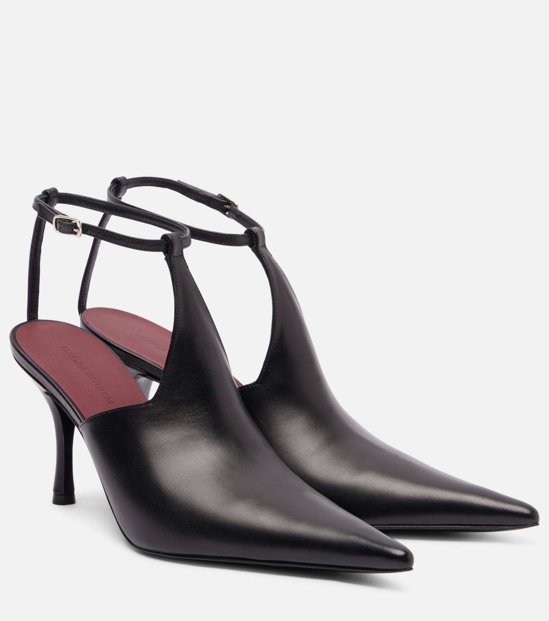 These leather pumps by Magda Butrym offer a refined finish with their pointed-toe silhouette and minimalist design. Set on mid-height stiletto heels, this pair features delicate ankle straps that seamlessly connect the back to the uppers. Product Details - Upper: leather (nappa) - Lining: leather - Sole: leather insole and sole - Toe shape: pointed toe - Made in Italy - Includes: dust bag, shoe box - Designer color name: Black - Item color: black - Closure: buckle-fastening ankle strap - Item number: P01081319 Size & Fit - True to size - European sizes - 8cm-3" heel (size EU 38)