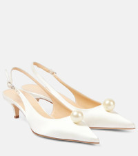 Product Details - Upper: fabric - Lining: leather - Sole: leather insole and sole - Toe shape: pointed toe - Made in Italy - Includes: shoe box, dust bag, extra heel tips - Designer color name: Cream - Closure: buckle fastening - Trim: faux pearl - Item number: P01014865 Size & Fit - Fits large to size - we recommend trying one size smaller - Narrow straps - European sizes - 4,5cm-2" heel (size EU 38)