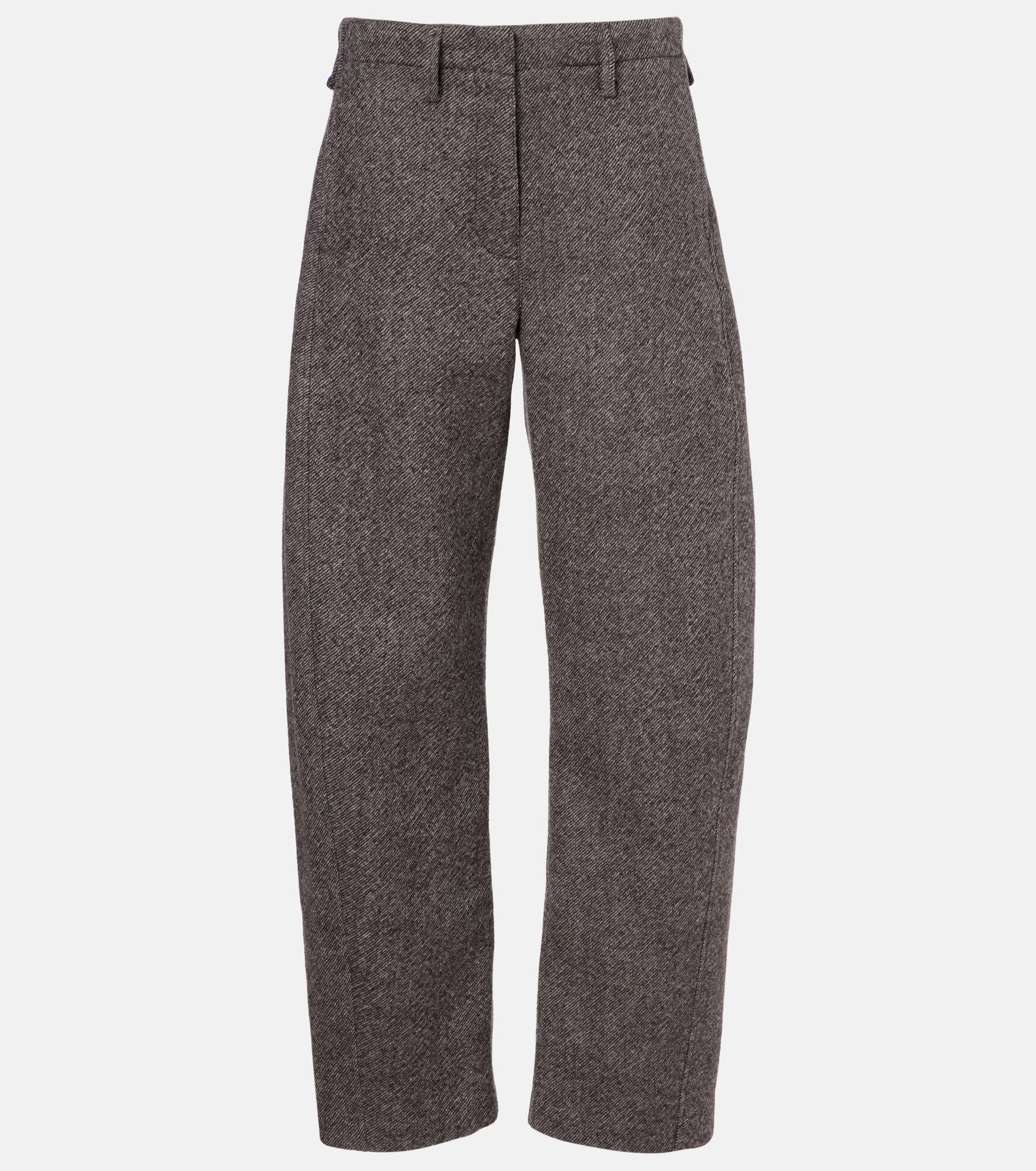 Magda Butrym aims to empower with sharp modern style, expertly delivered through artisanal excellence. Crafted from a wool blend with a silk lining, these barrel-leg pants are designed with a dropped waistline and a herringbone pattern. Product Details - Material: 97% wool, 3% polyamide - Care instructions: dry clean - Made in Poland - Designer color name: Grey - Item color: gray - Lining: 100% silk - Closure: zipper, hook fastening - Belt loops - Pockets: side slit pockets, back pockets - Item number: P01086730 Size & Fit - True to size - Non-stretchy fabric - Tapered leg - Sits low on the hips - The model seen in the picture is 178cm-5'10" and wearing a size FR 36